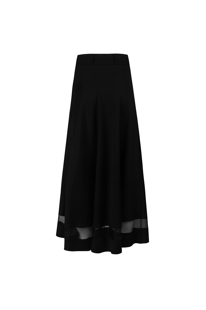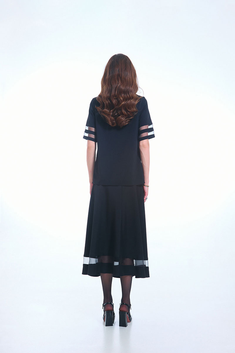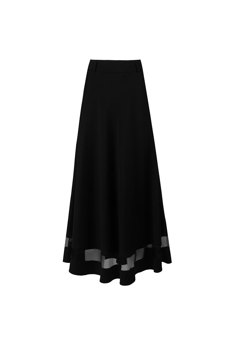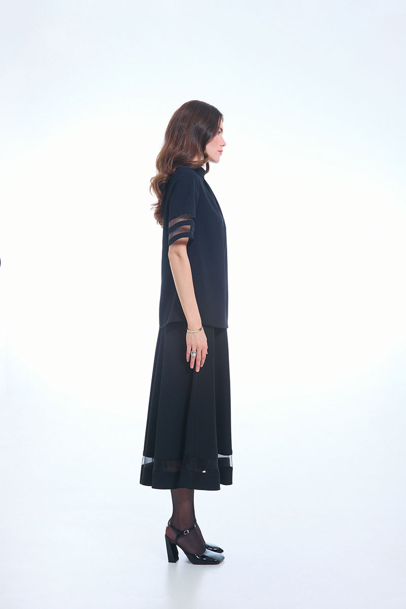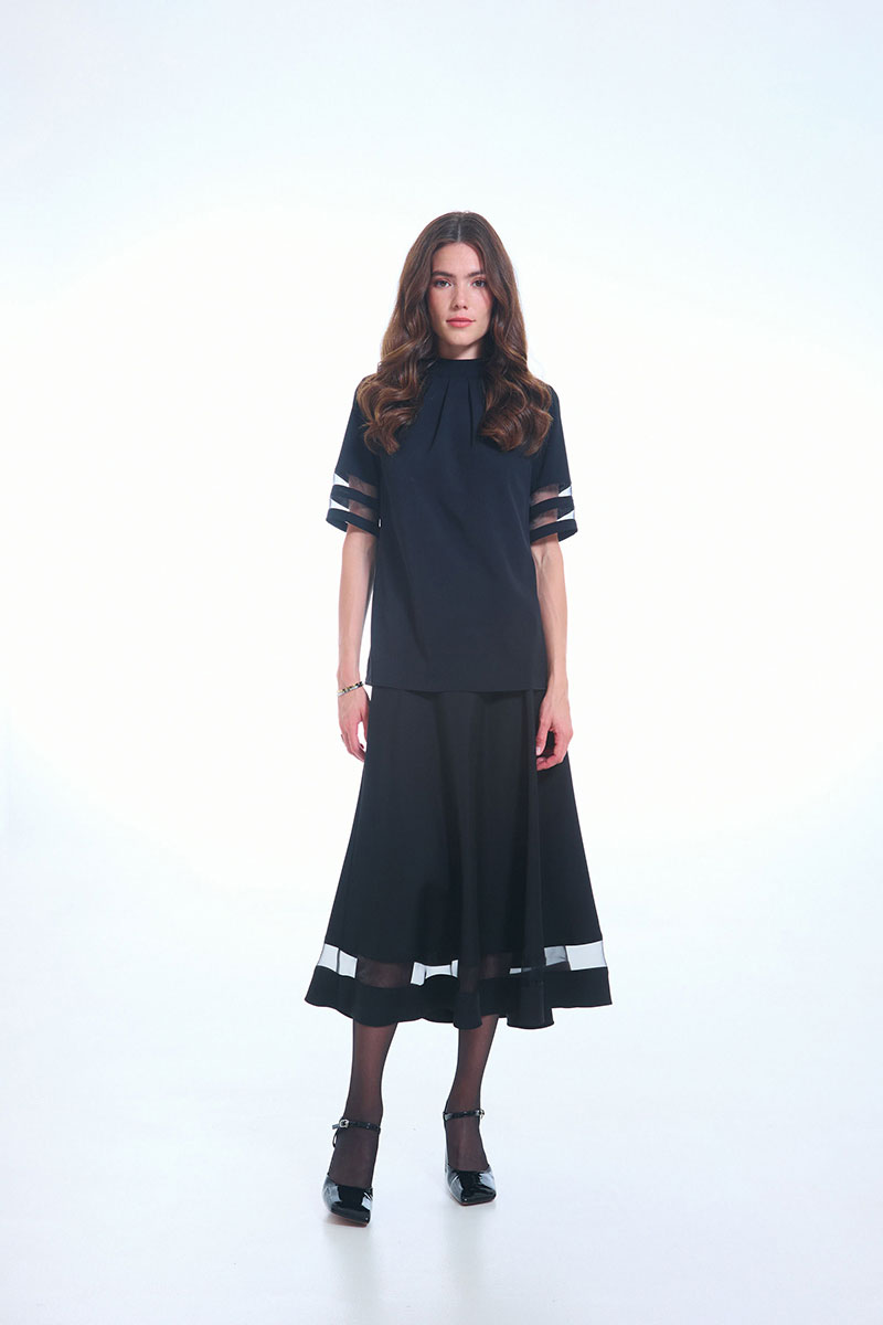 Юбка женская без подкладки, длина «миди», расширенная к низу. Перед и спинка с отделочными полупрозрачными вставками. Пояс притачной, со шлевками.