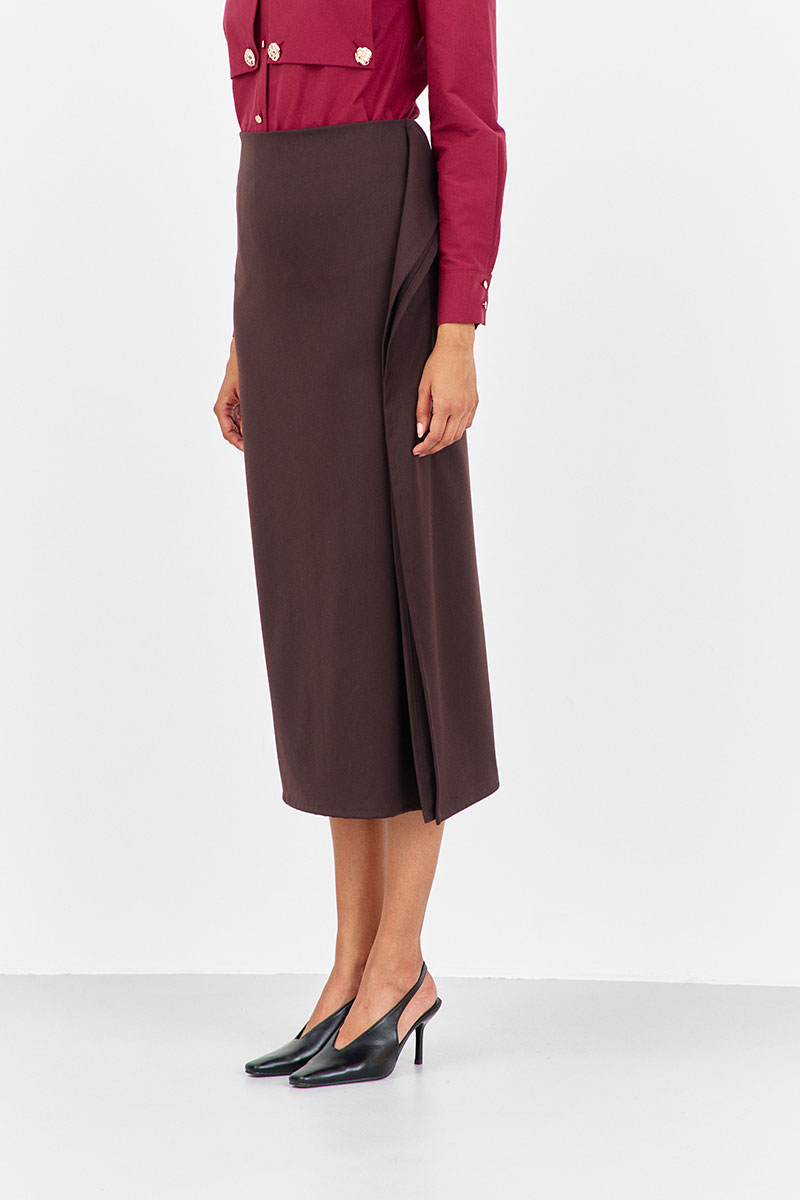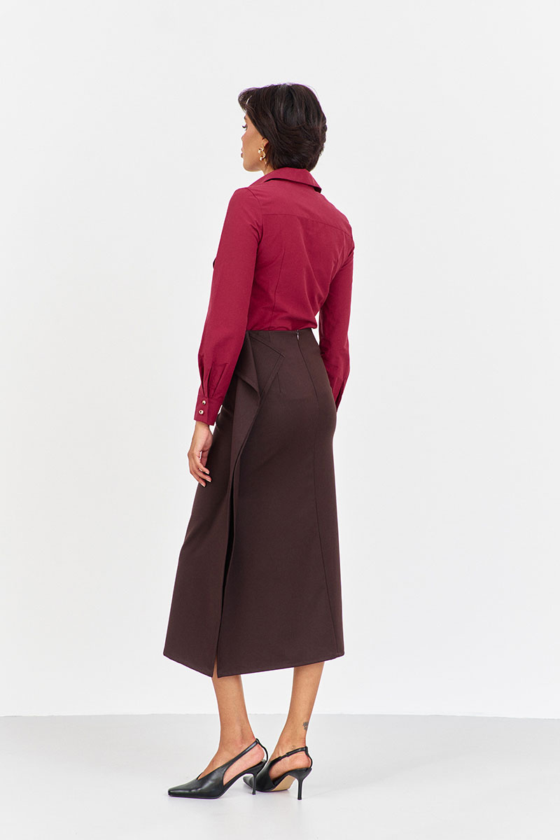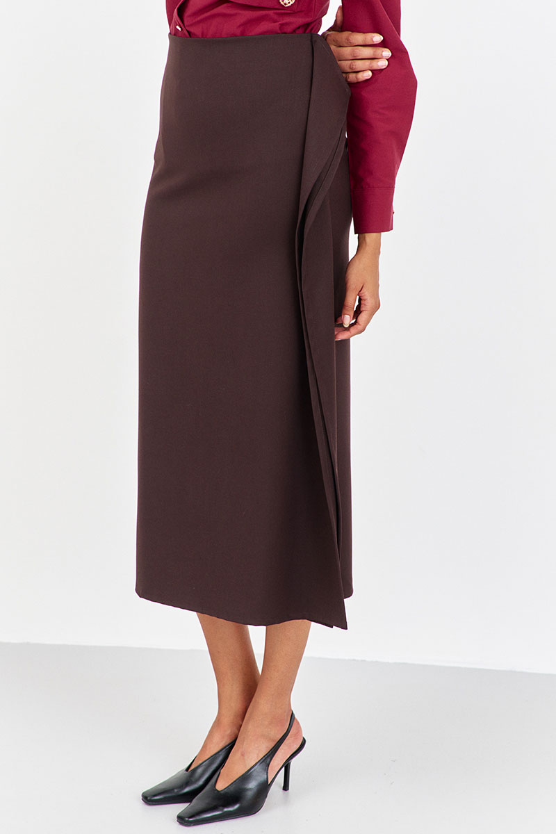 Юбка с декоративным воланом в длине миди. Характеристики: выполнена из костюмно-плательной ткани в цвете шоколад, в боковом левом шве обработан декоративный волан, застежка-молния по заднему полотнищу юбки, верх юбки обработан поясом-обтачкой.