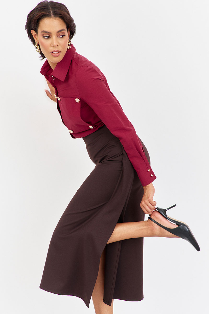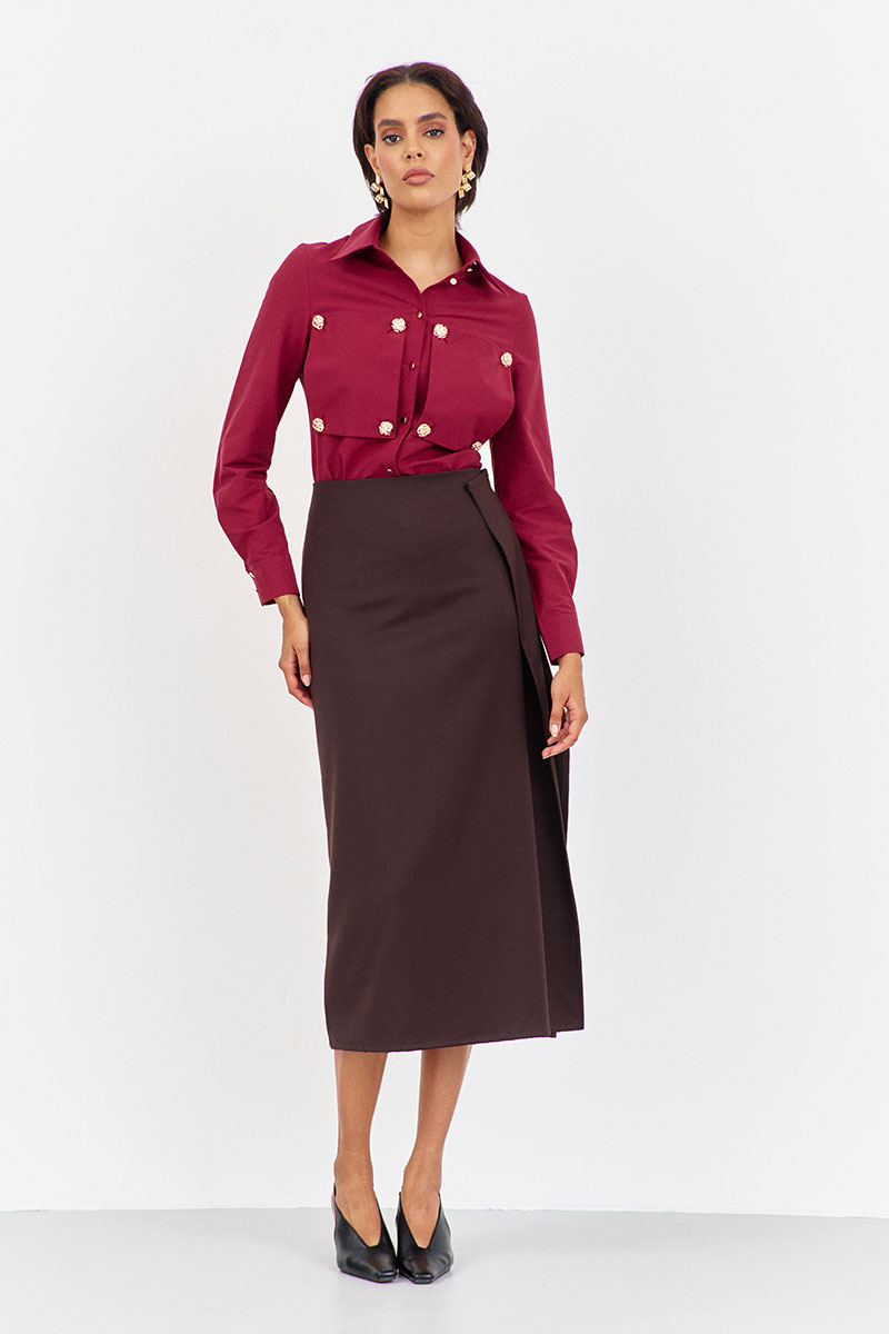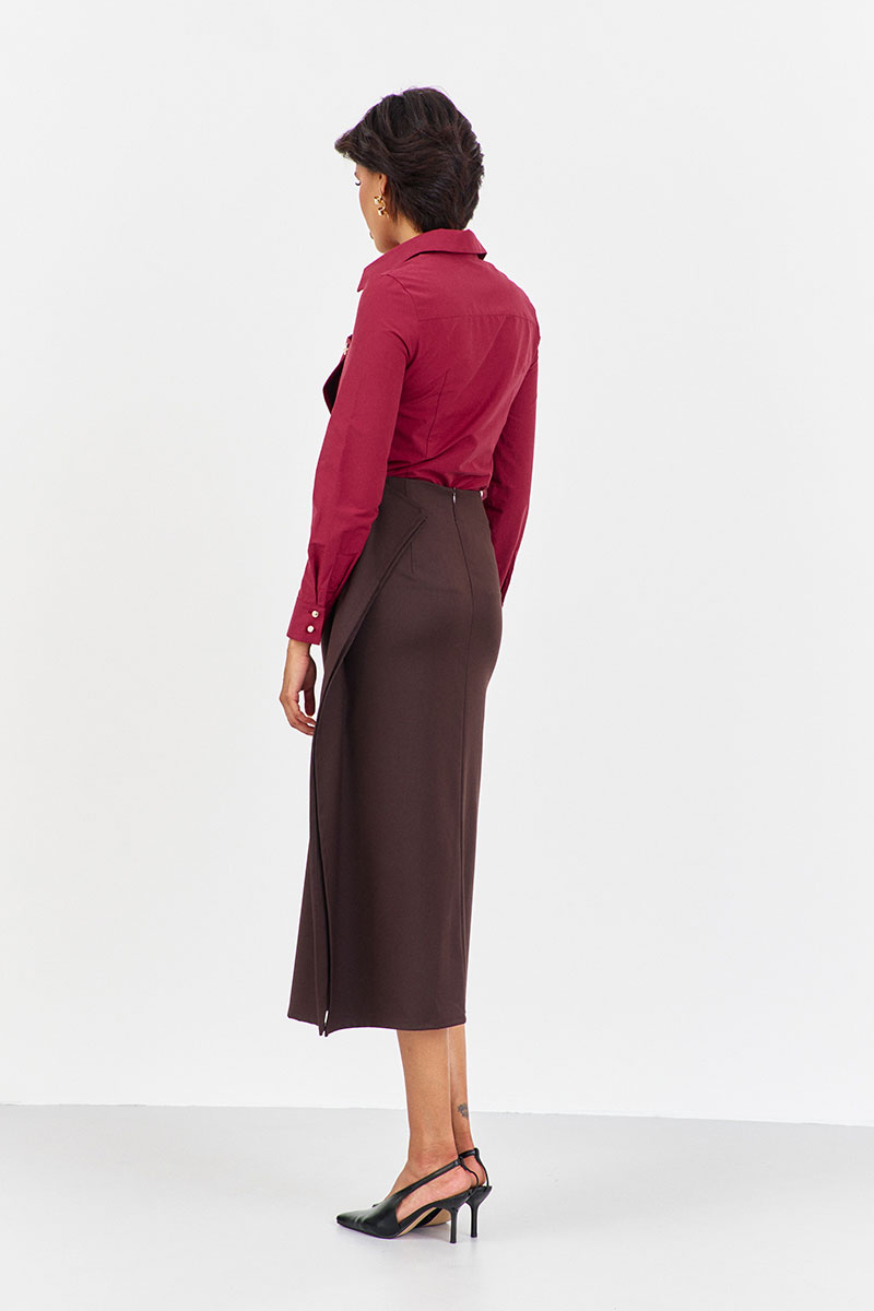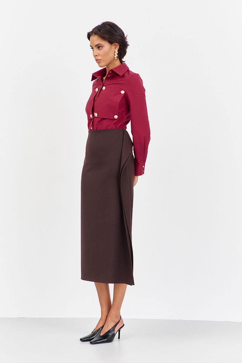 Юбка с декоративным воланом в длине миди. Характеристики: выполнена из костюмно-плательной ткани в цвете шоколад, в боковом левом шве обработан декоративный волан, застежка-молния по заднему полотнищу юбки, верх юбки обработан поясом-обтачкой.