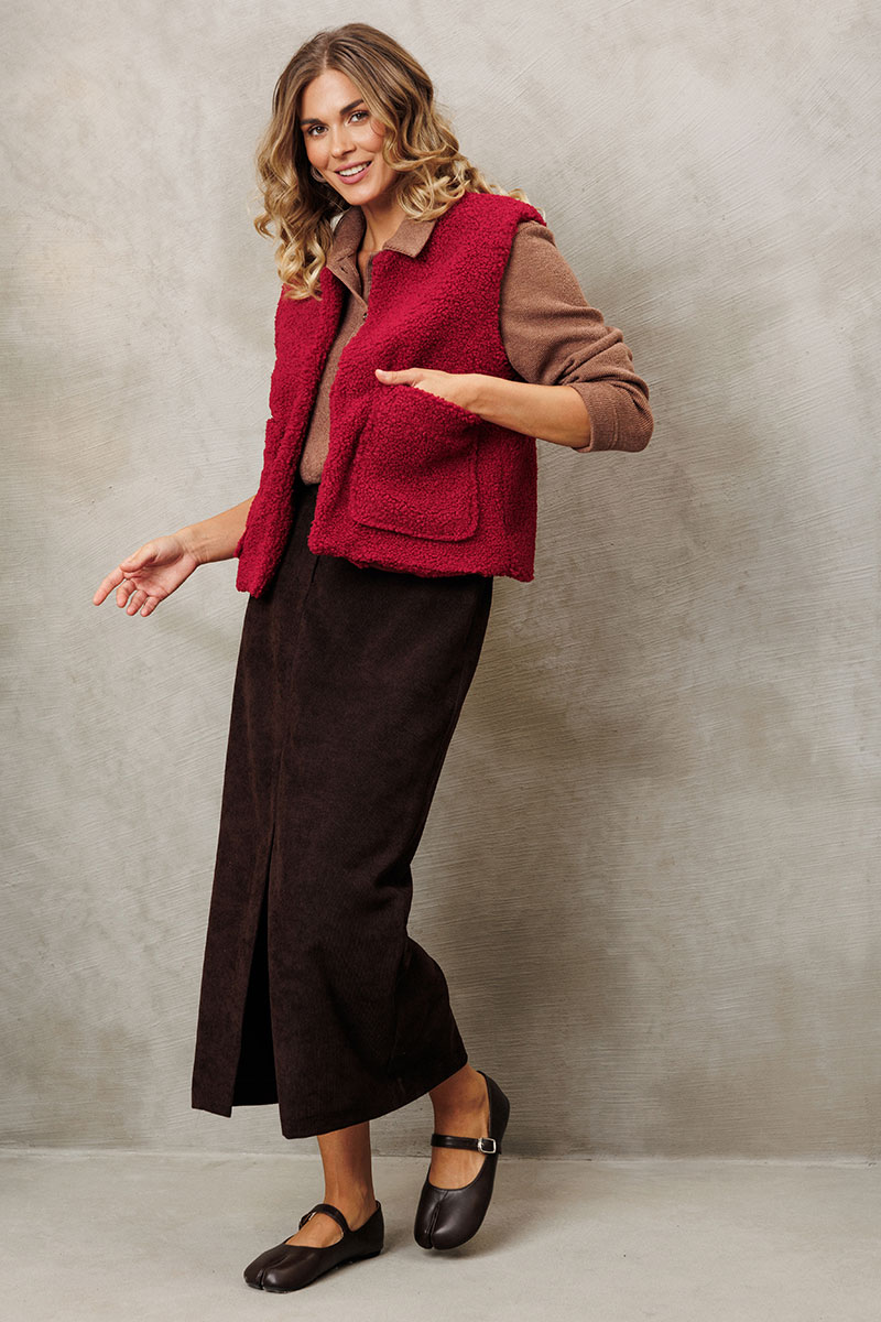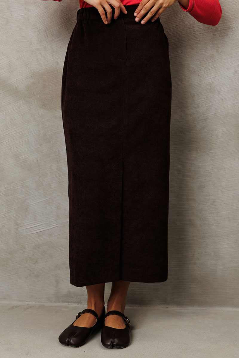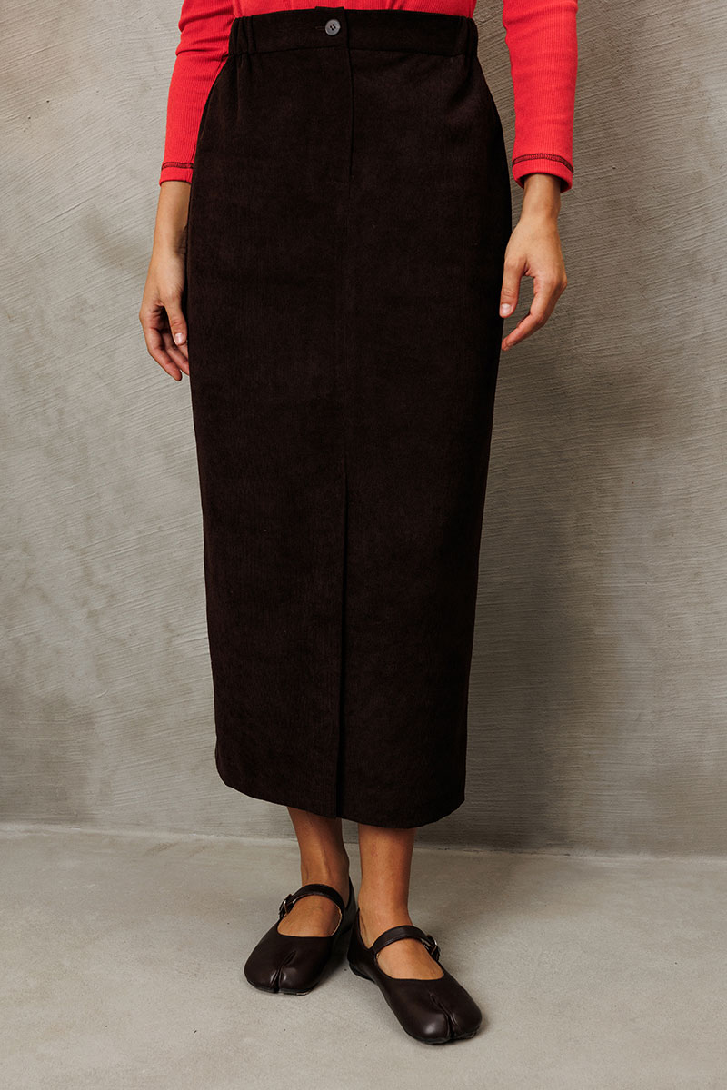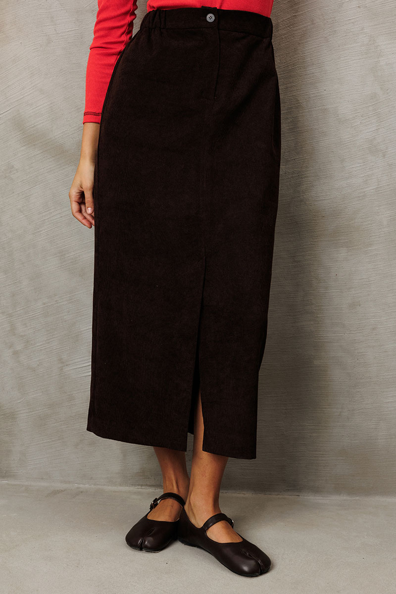 Юбка прямого силуэта выполненная из мягкой вельветовой ткани. Передняя честь юбки с вытачками, со средним швом и застежкой гульфиком на молнии и щлицей спереди. Задняя часть юбки с вытачками. Юбка на притачном поясе с затежкой на петлю и пуговицу спереди и резинками по бокам. Юбка на подкладке.