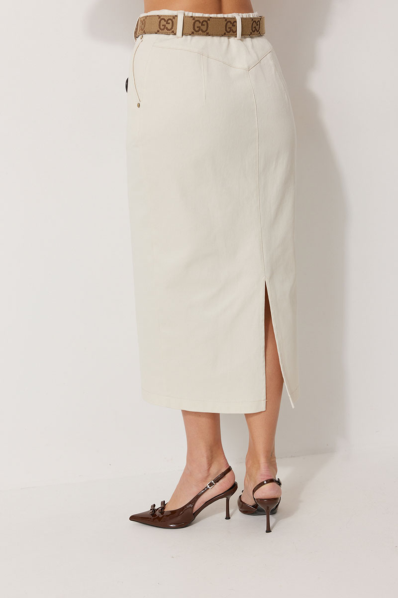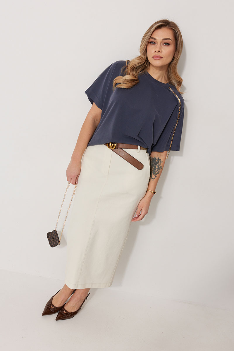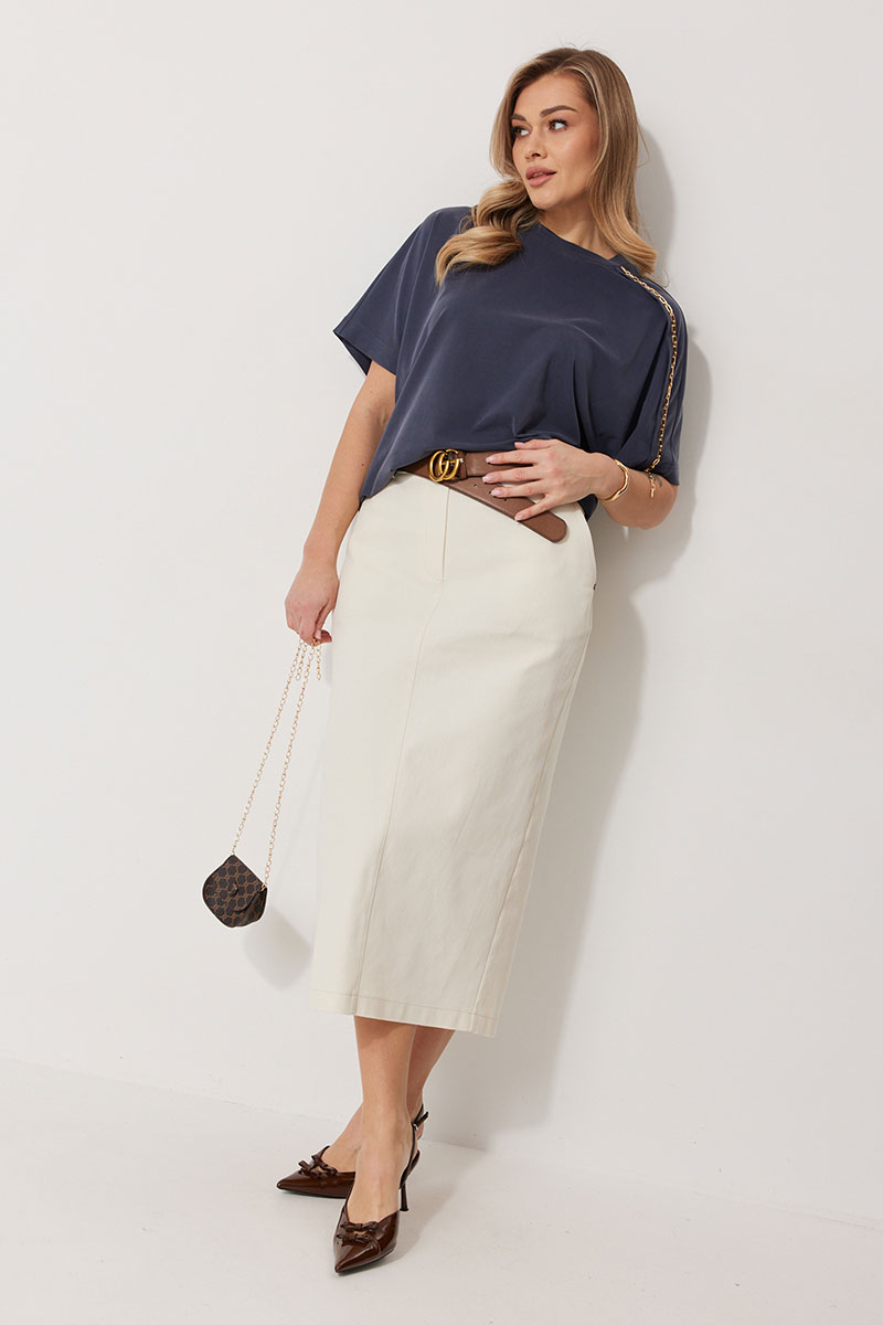 Юбка-карандаш женская из джинсовой ткани. Длина юбки до середины икры. По переду в юбке обработаны карманы с отрезным бочком, по концам кармана установлены хольнитены. Перёд юбки с центральным швом, в котором обработан гульфик с застежкой – молнией. Спинка юбки со средним швом в котором располагается разрез. Верх спинки юбки с отрезной фигурной кокеткой и вытачками. Верхний срез юбки обработан отрезным поясом, с резинкой по спинке и шлевками. Пояс застегивается на кнопку.