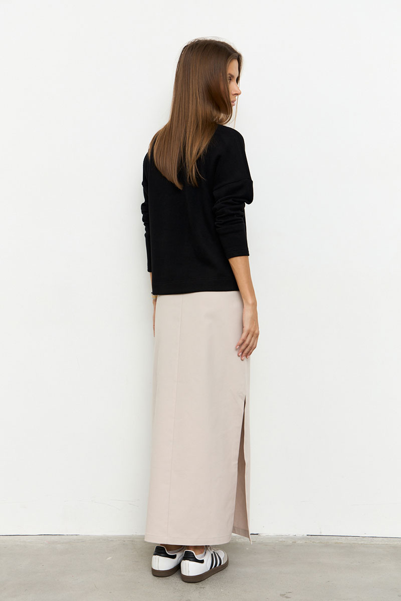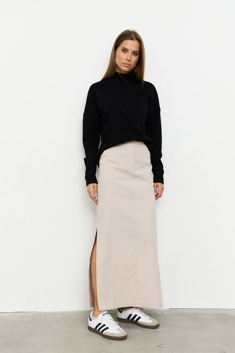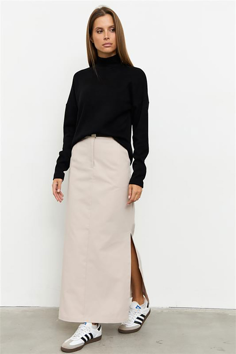 Юбка прямого силуэта из джинса средней плотности с высокими разрезами в боковых швах. Передняя часть юбки с вытачками и центральным швом, в котором обработана застежка на тесьму-молнию. Спинка со средним швом и вытачками. В боковых швах обработаны наклонные карманы. Пояс притачной со шлевками и застежкой на пуговицу.