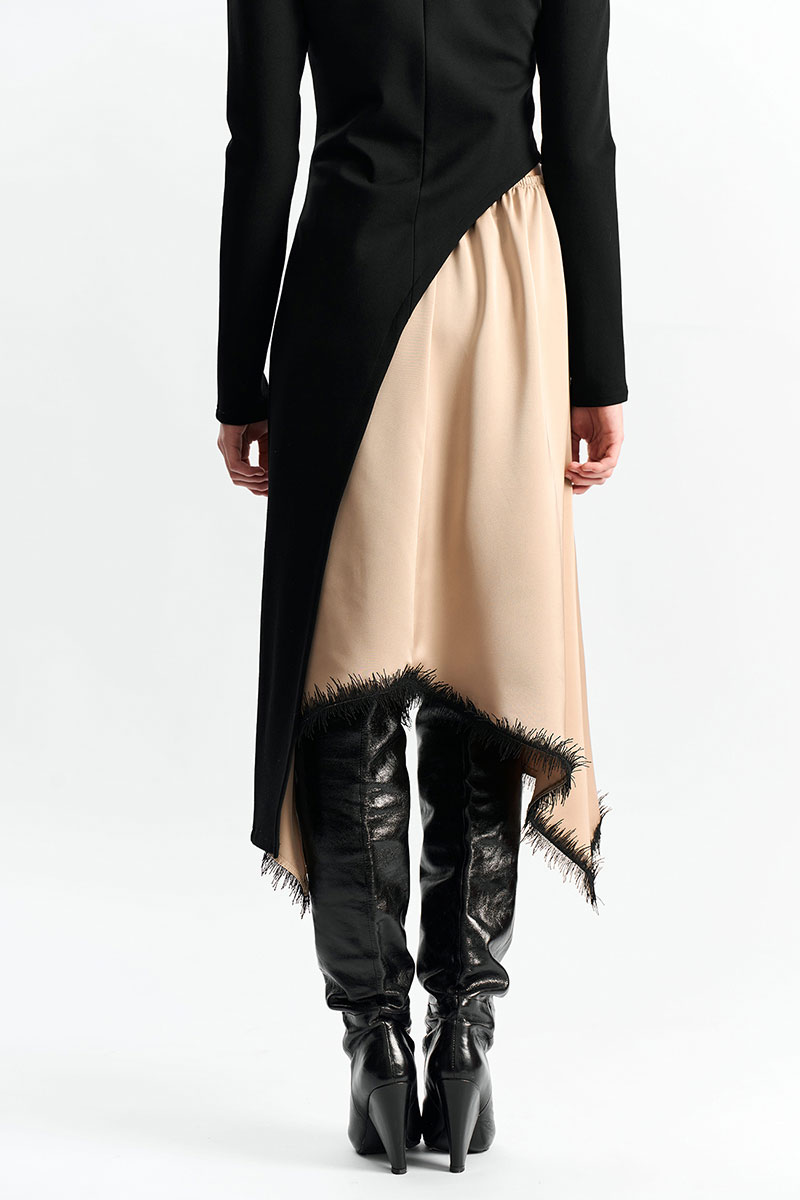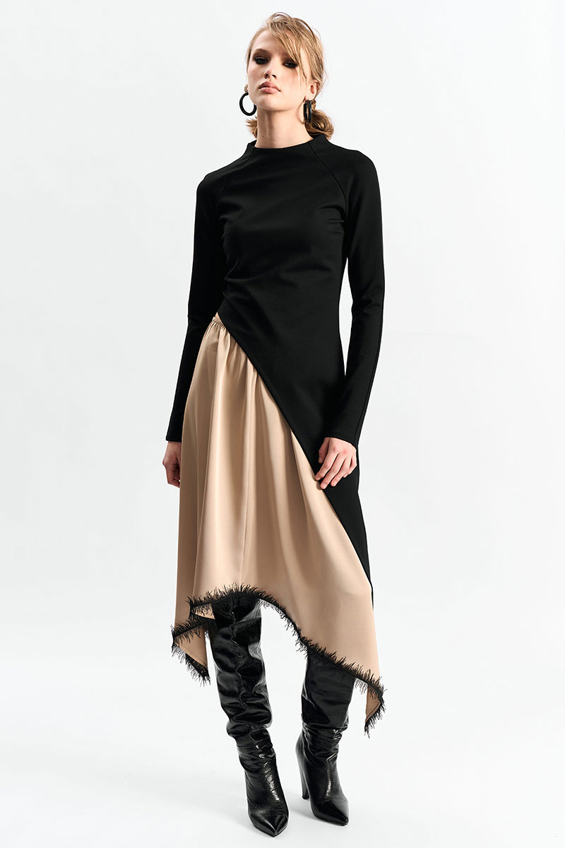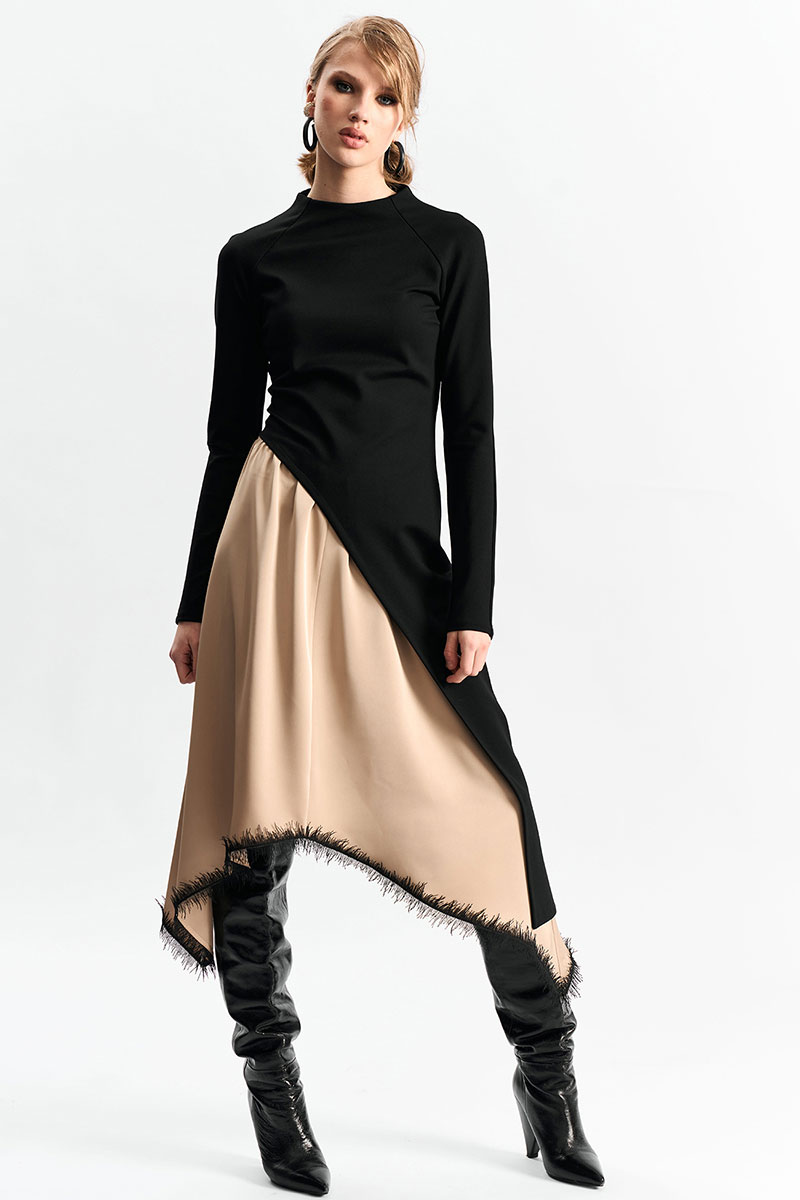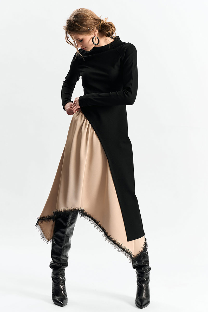 Юбка с резинкой по талии А-силуэта и фигурной линией низа отделанной французским кружевом.