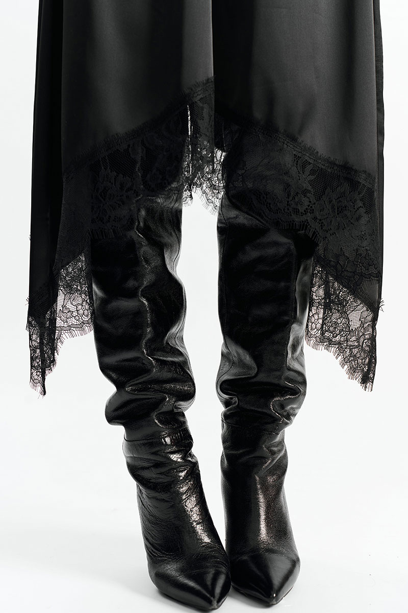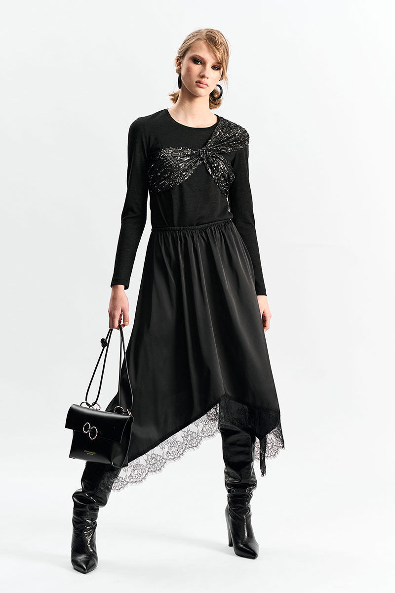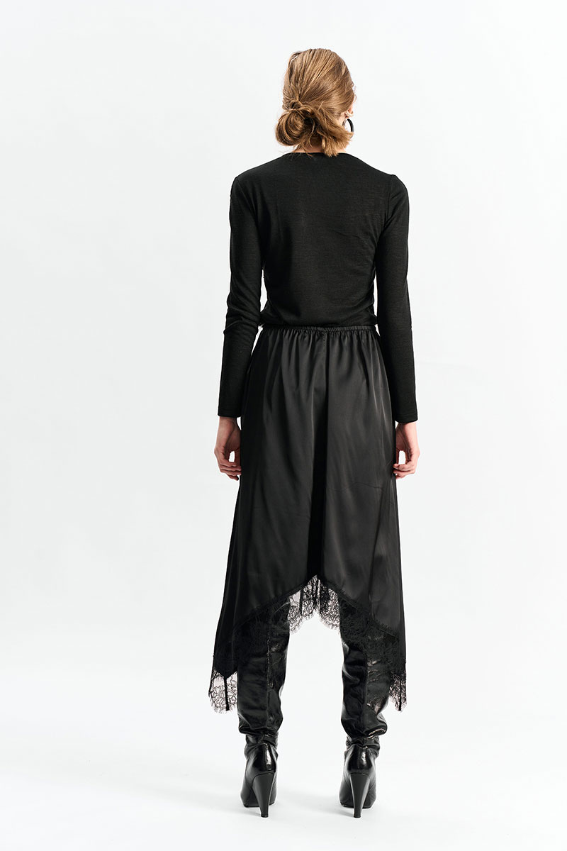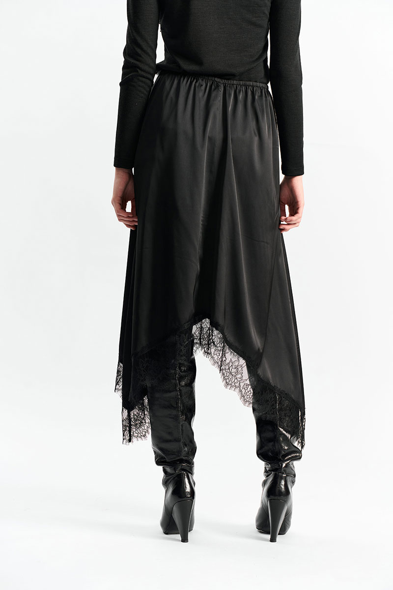 Юбка с резинкой по талии А-силуэта и фигурной линией низа отделанной французским кружевом.