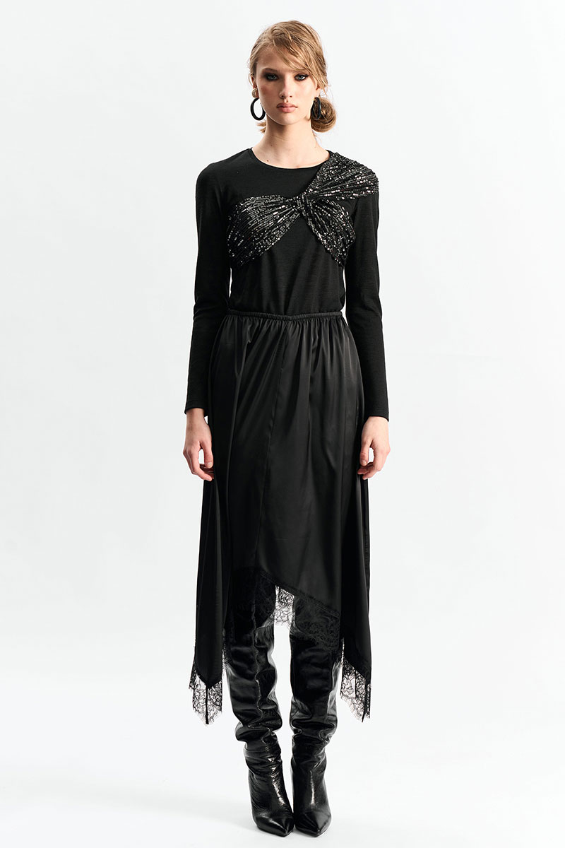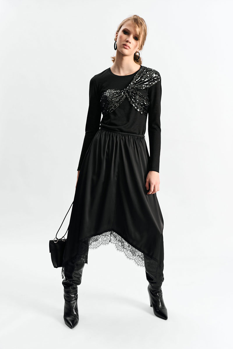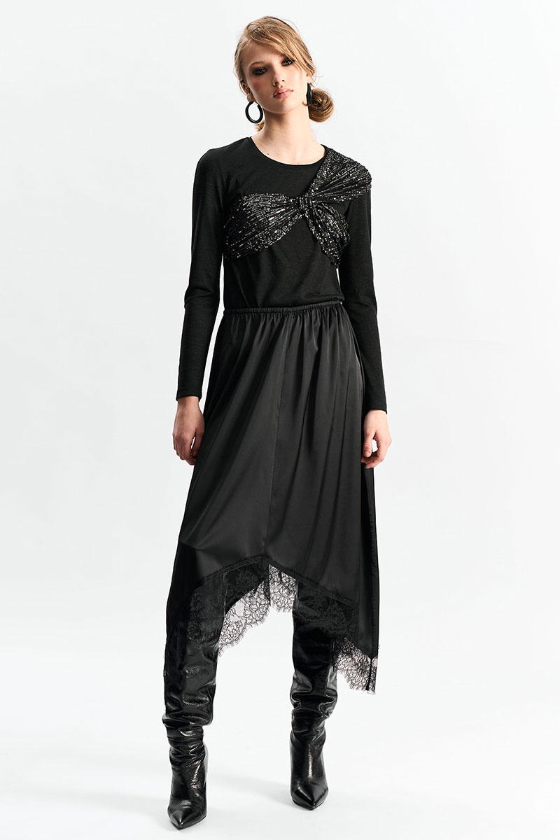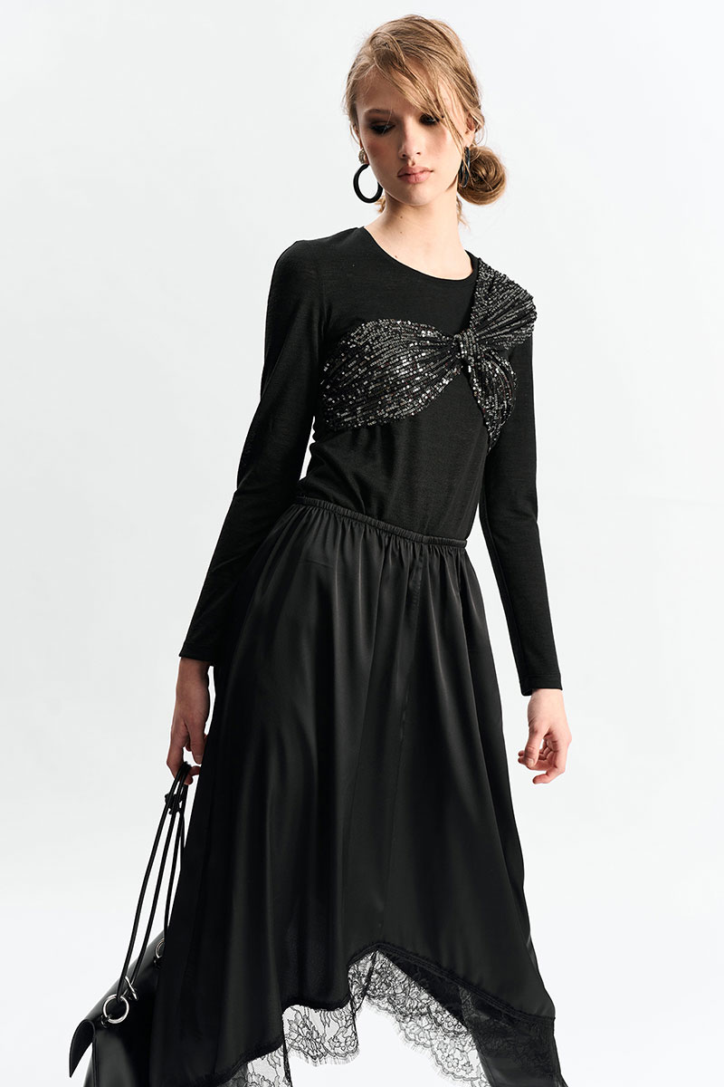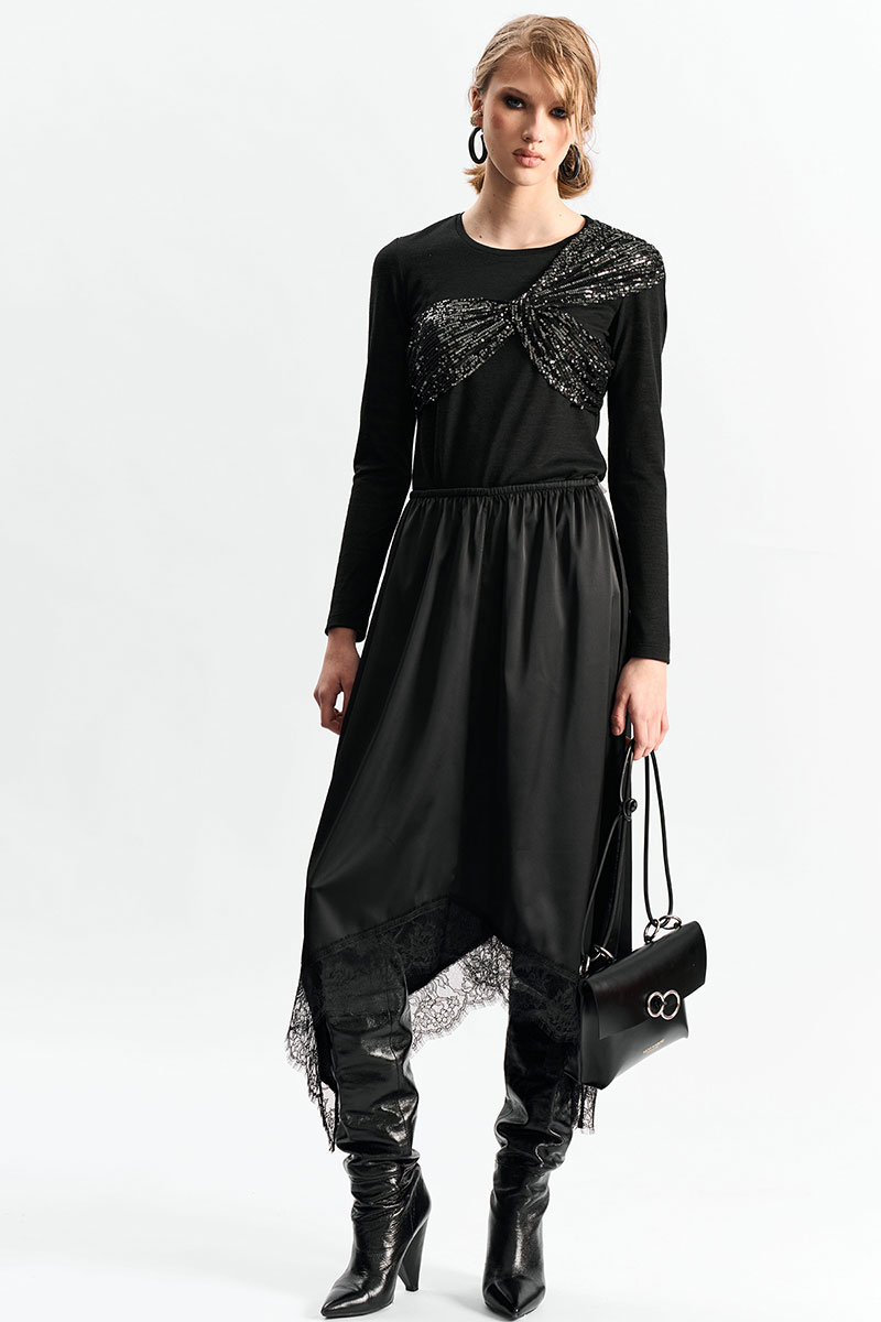 Юбка с резинкой по талии А-силуэта и фигурной линией низа отделанной французским кружевом.