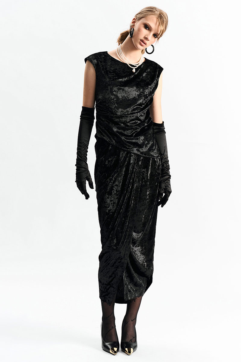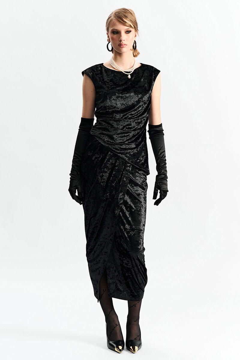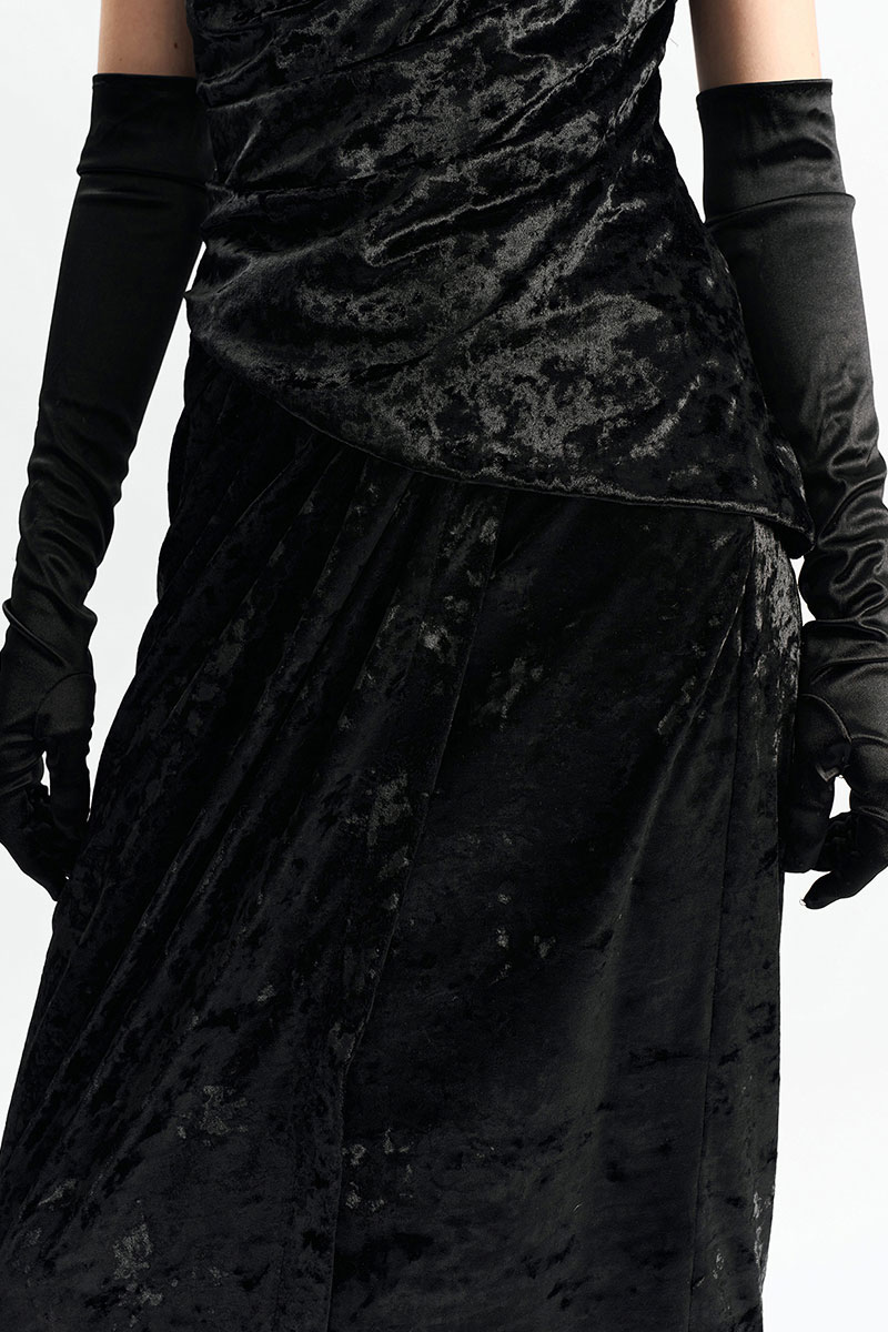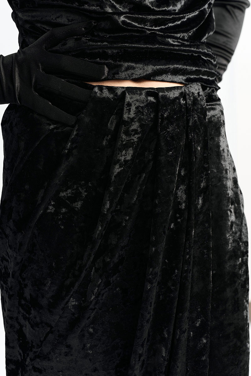 Юбка длины миди из фактурного бархата на запах. По переду в поясе заложены конструктивные складки.