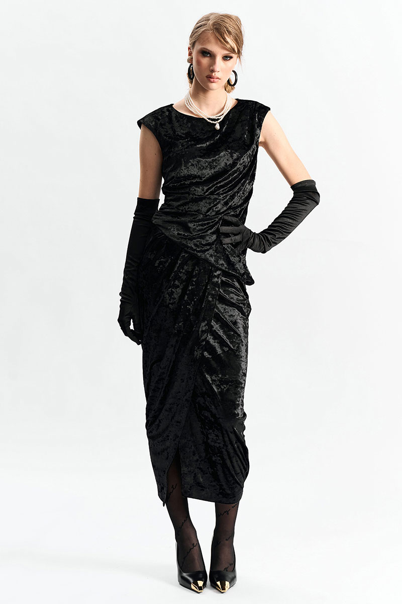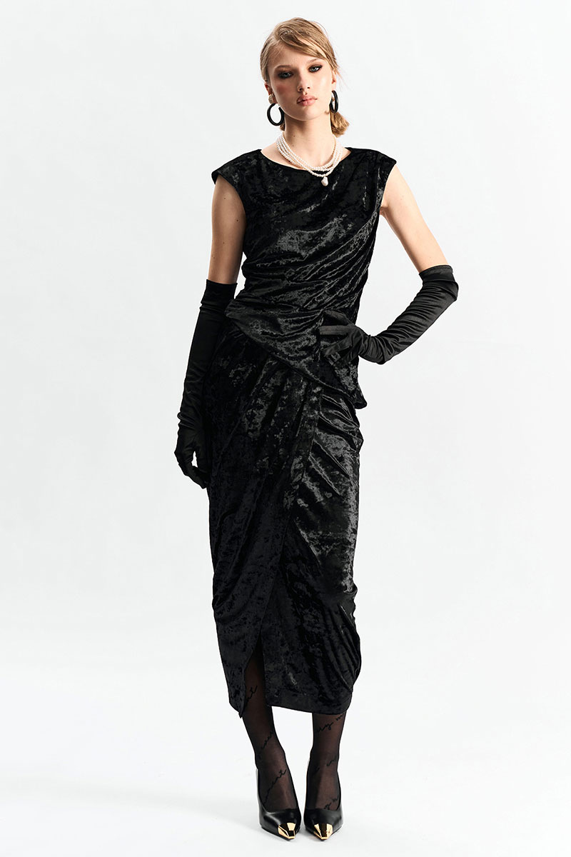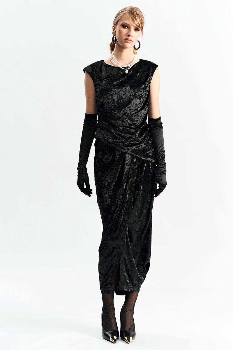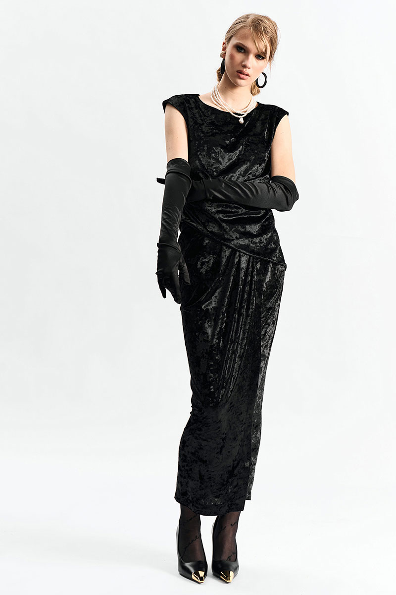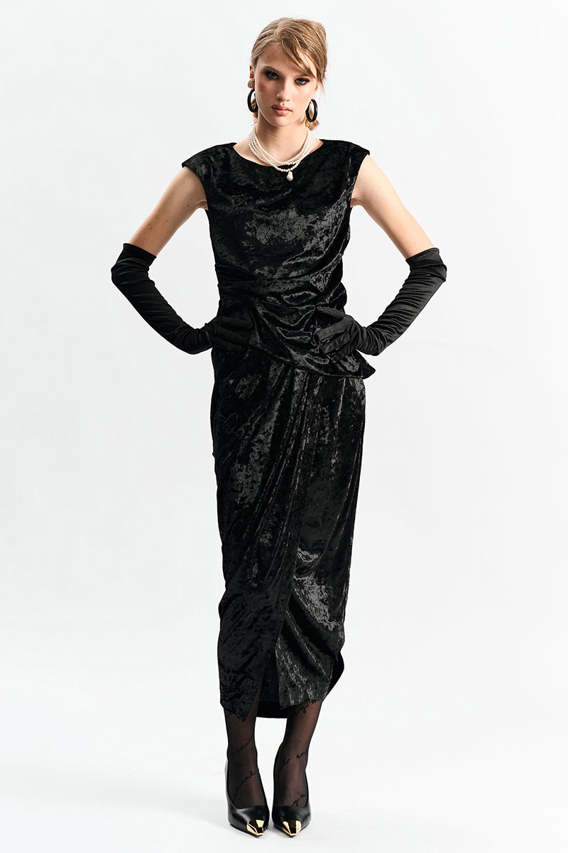Юбка длины миди из фактурного бархата на запах. По переду в поясе заложены конструктивные складки.