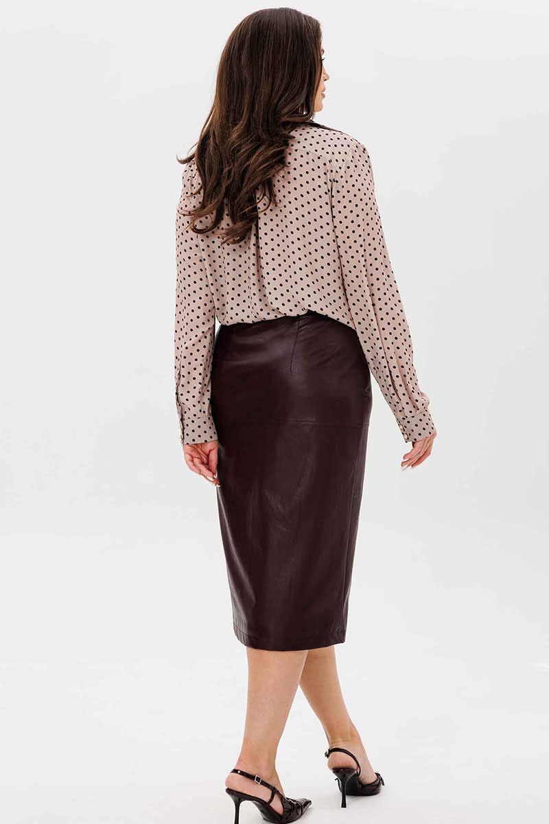 Юбка прямого силуэта, отрезная ниже линии талии, на притачном поясе, выполнена из экокожи. В центральном шве переда застёжка на молнию с гульфиком и откоском и шлица с разрезом. Пояс застёгивается на прорезную петлю и пуговицу. Талиевые вытачки по переду и спинке. Боковые функциональные карманы. Юбка на подкладке. Юбку украшают отделочные строчки.