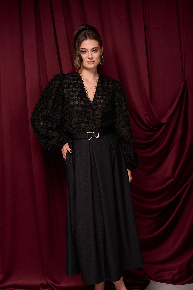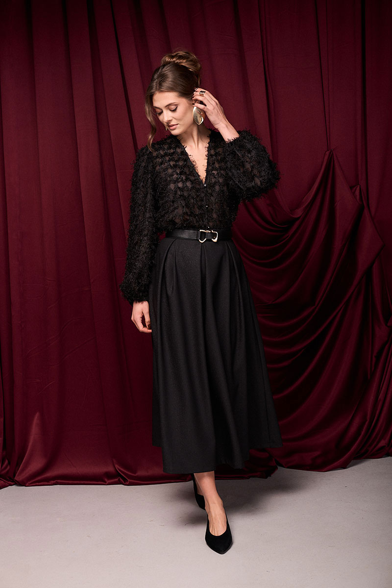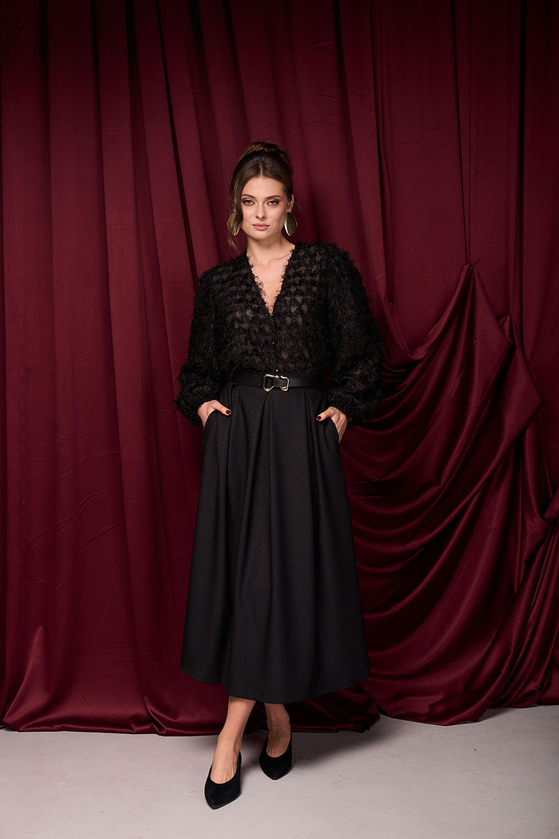 Юбка из ткани с деликатным блеском. По поясу складки. Молния по спинке.