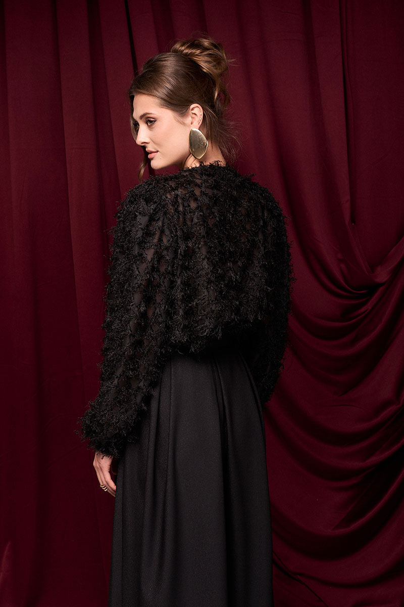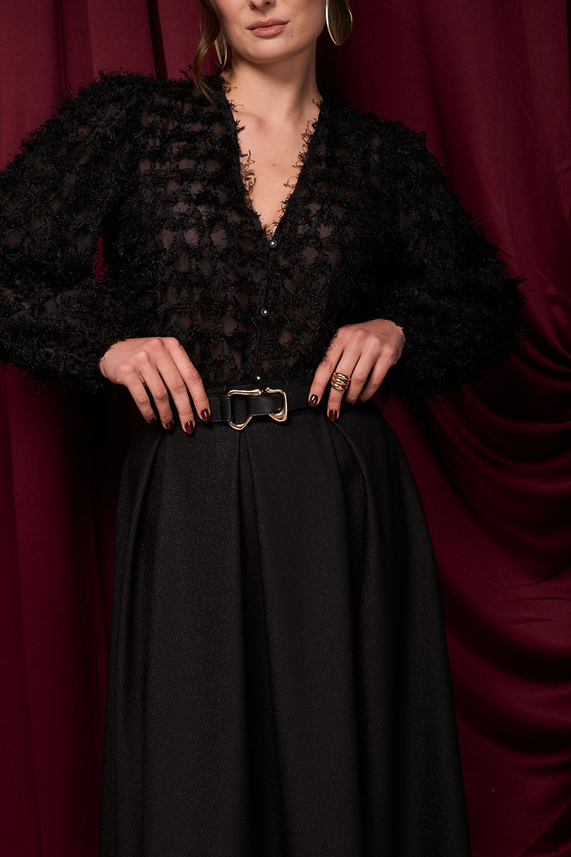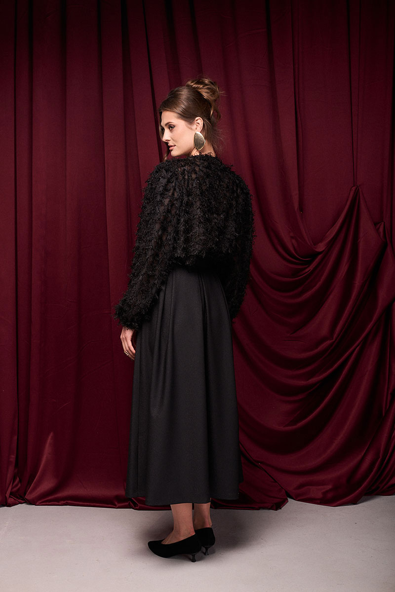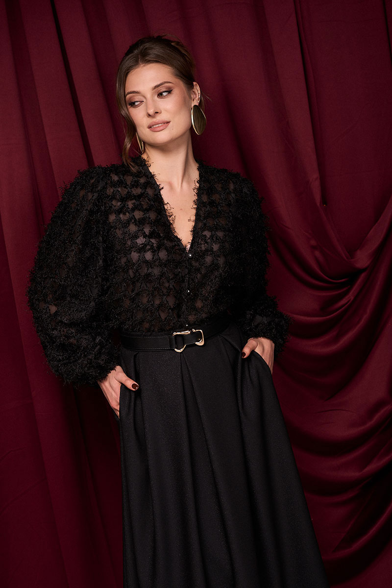 Юбка из ткани с деликатным блеском. По поясу складки. Молния по спинке.