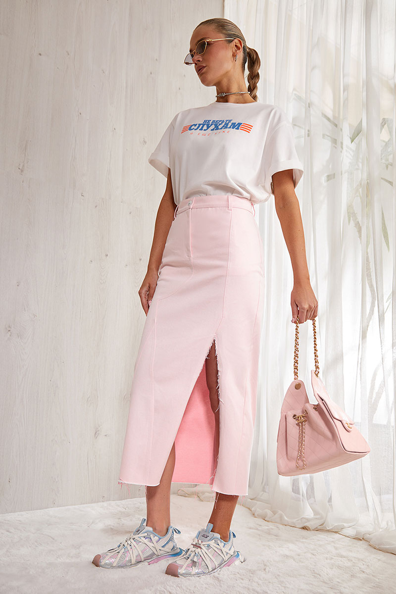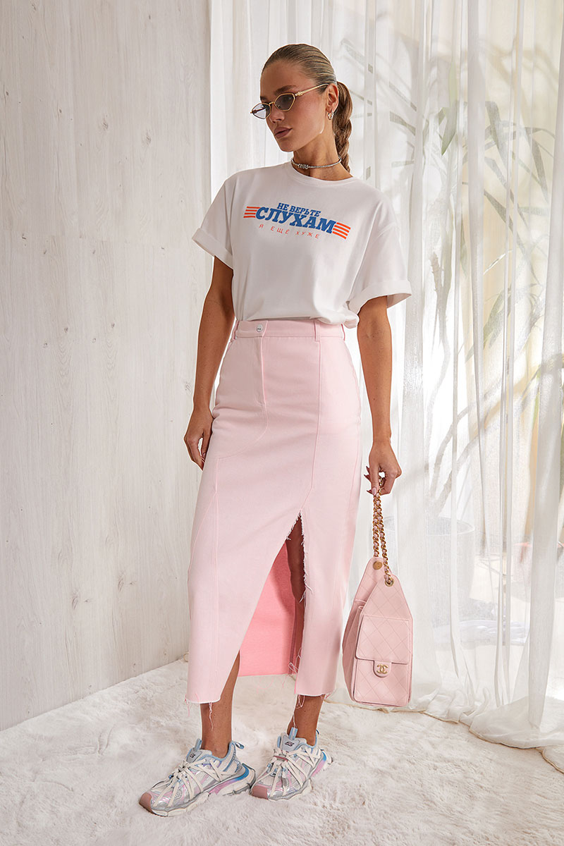 Джинсовая юбка длина midi. Юбка на поясе со шлевками, немного зауженная книзу. Застежка спереди. Карманы и фигурные вертикальные подрезы на передних половинках, в одном из которых выполнен разрез с необработанным краем. Сзади в юбке средний шов, фигурная кокетка и накладные карманы. Низ изделия не обработан.