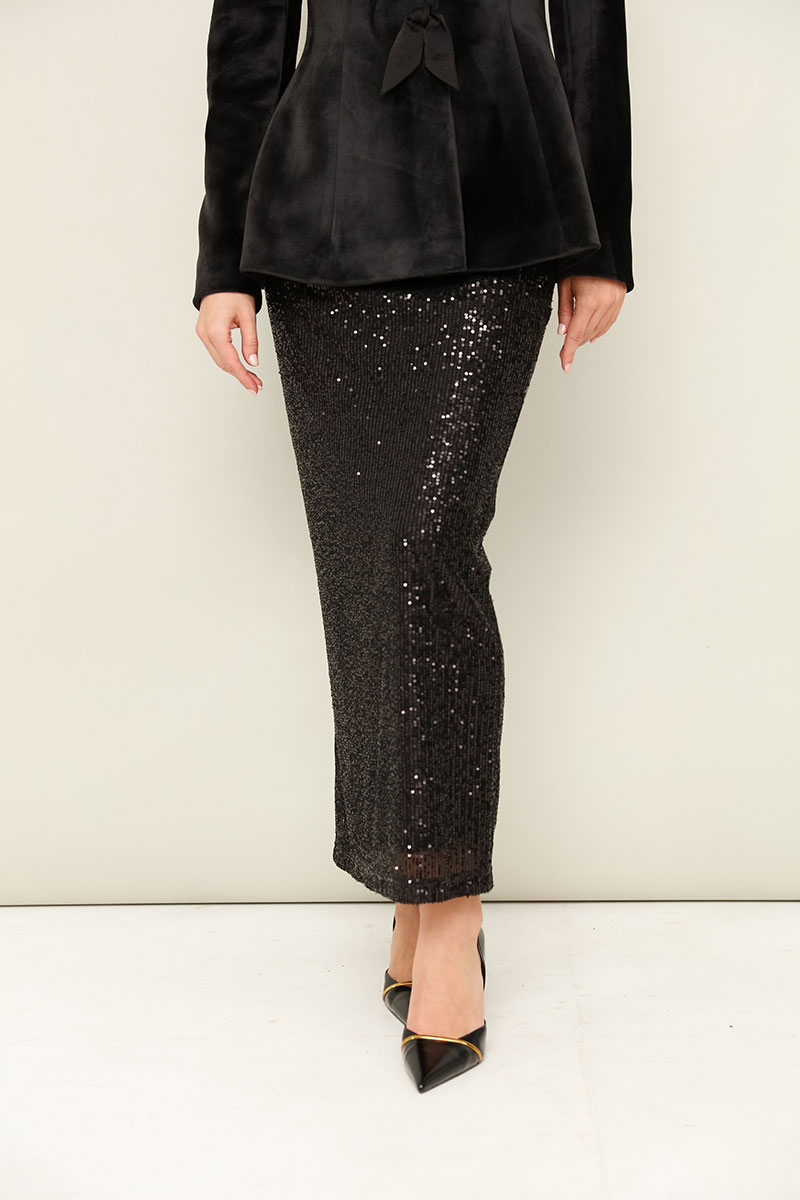 Юбка, декорированная пайетками, на подкладке. Пояс на резинке, хорошо тянется. Юбка прямого полуприлегающего силуэта.