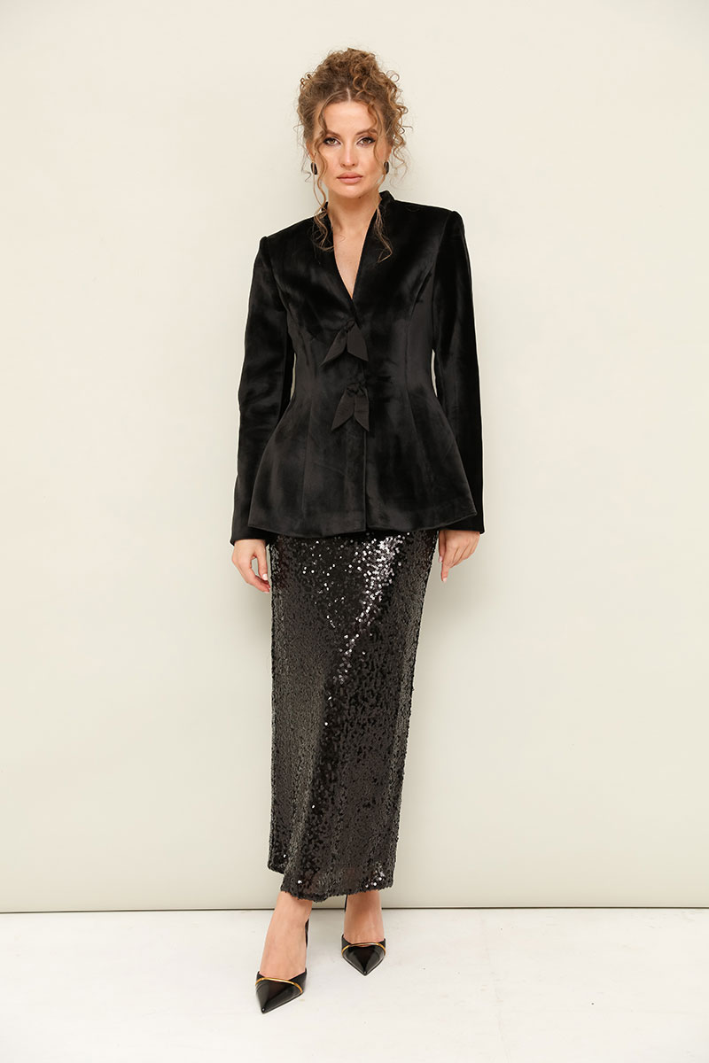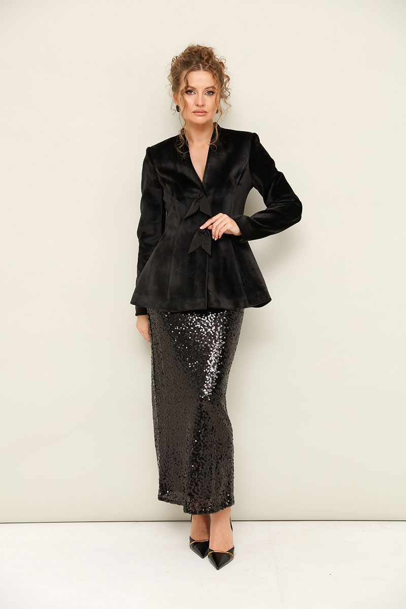Прямая юбка из велюра с пришитыми во верху пайетками. Пояс юбки на резинке. Юбка на подкладке, сзади разрез для свободы движения.