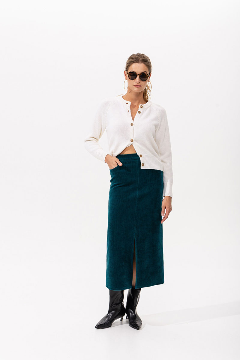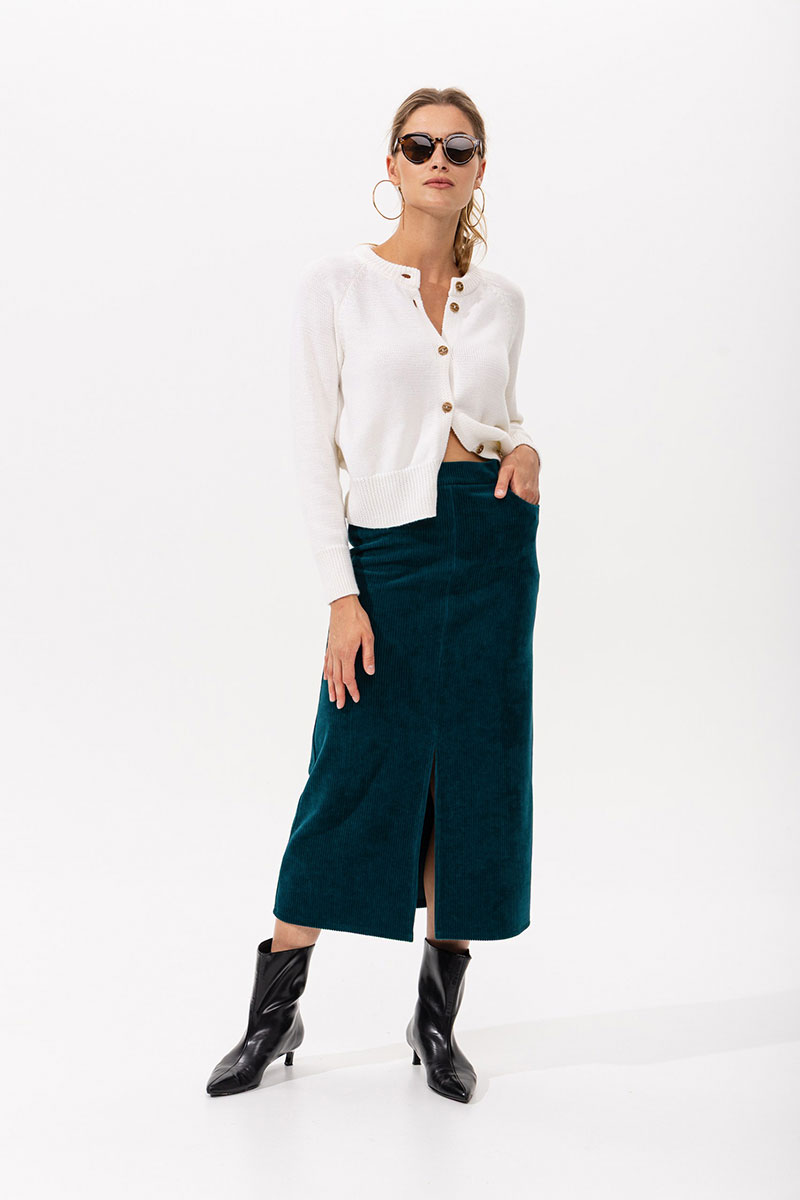 Фасон: Классическая юбка-карандаш с небольшим разрезом спереди, что придаёт ей современный и женственный вид.