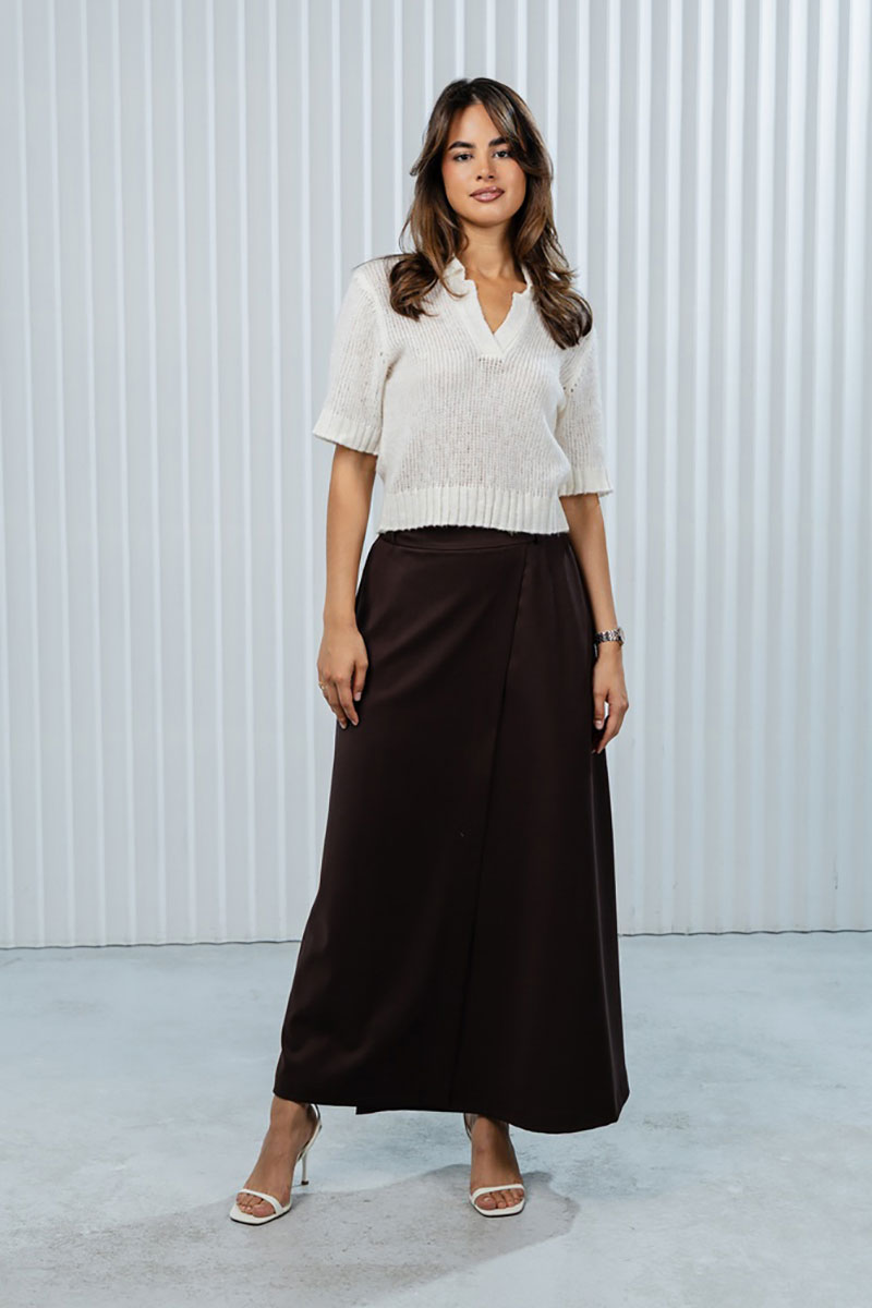 Юбка отлично сочетается с блузками, как на фото, свитерами или рубашками. Для завершения образа подойдут туфли на каблуке, лодочки или стильные сандалии. Дополните образ минималистичными аксессуарами, такими как тонкий ремень или серьги.