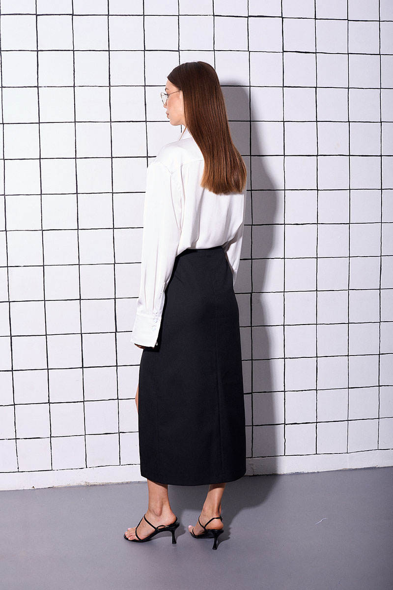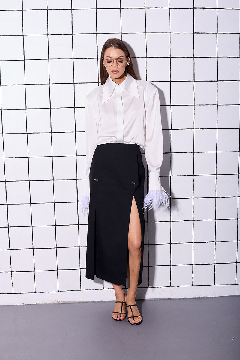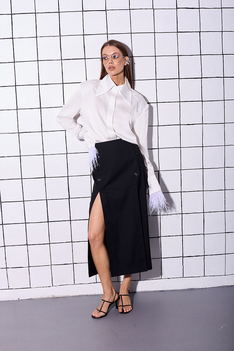 Юбка прямого силуэта, длина миди, с двумя разрезами по переду и декоративными пуговицами. Застежка по спинке на потайную молнию.