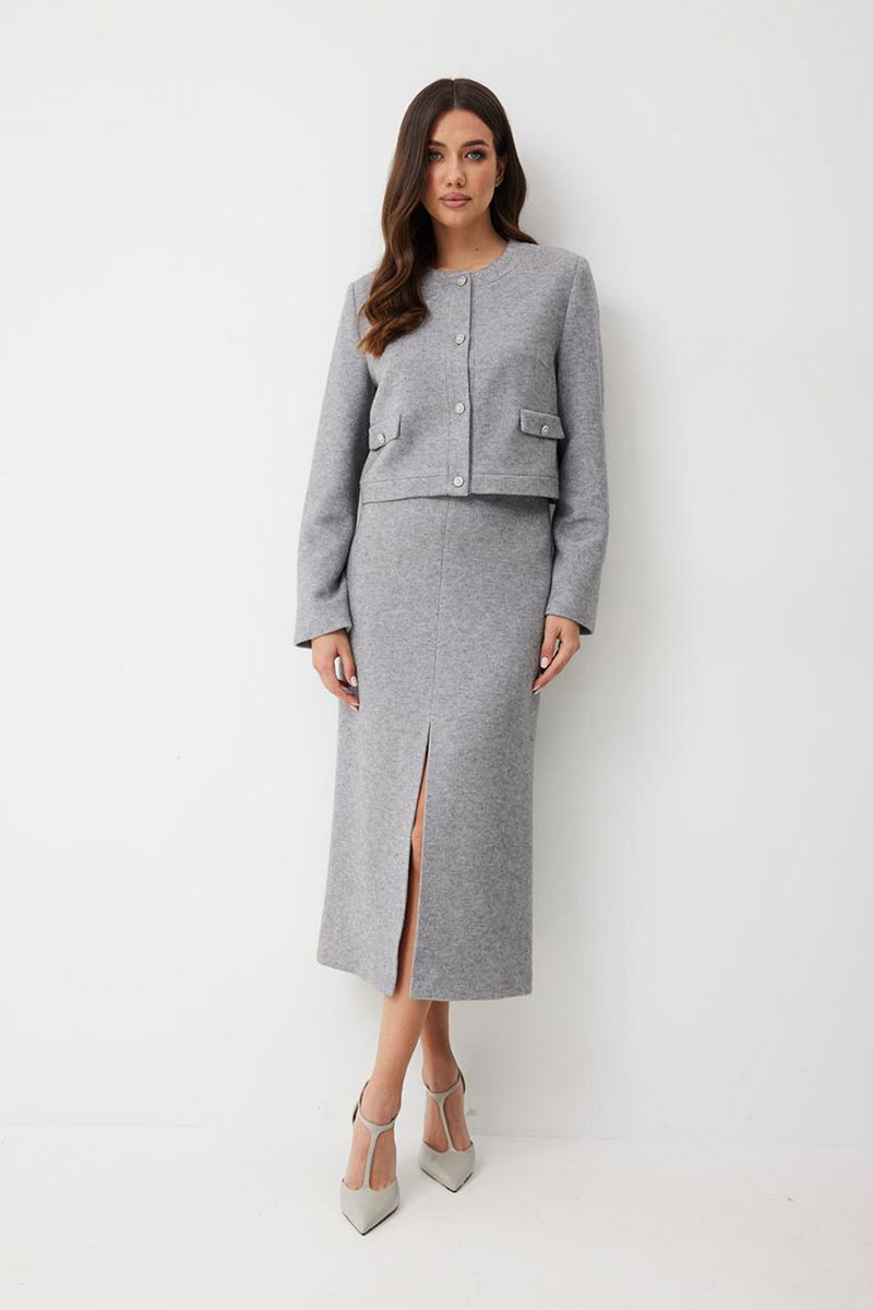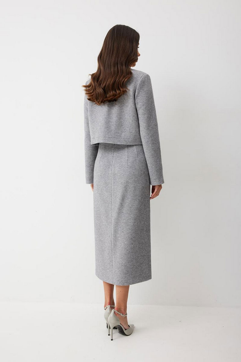 Женская юбка - карандаш длиной миди с посадкой на талии, выполнена из трикотажного полотна. Модель имеет прямой крой и аккуратную посадку по фигуре, подчёркивая силуэт и оставаясь при этом удобной в носке. По переднему полотнищу средний шов, заканчивающийся высоким разрезом, длиной 43 см, который добавляет женственность и комфорт при движении. Пояс притачной, застежка на потайную молнию в среднем шве сзади. Юбка на поливискозной подкладке.