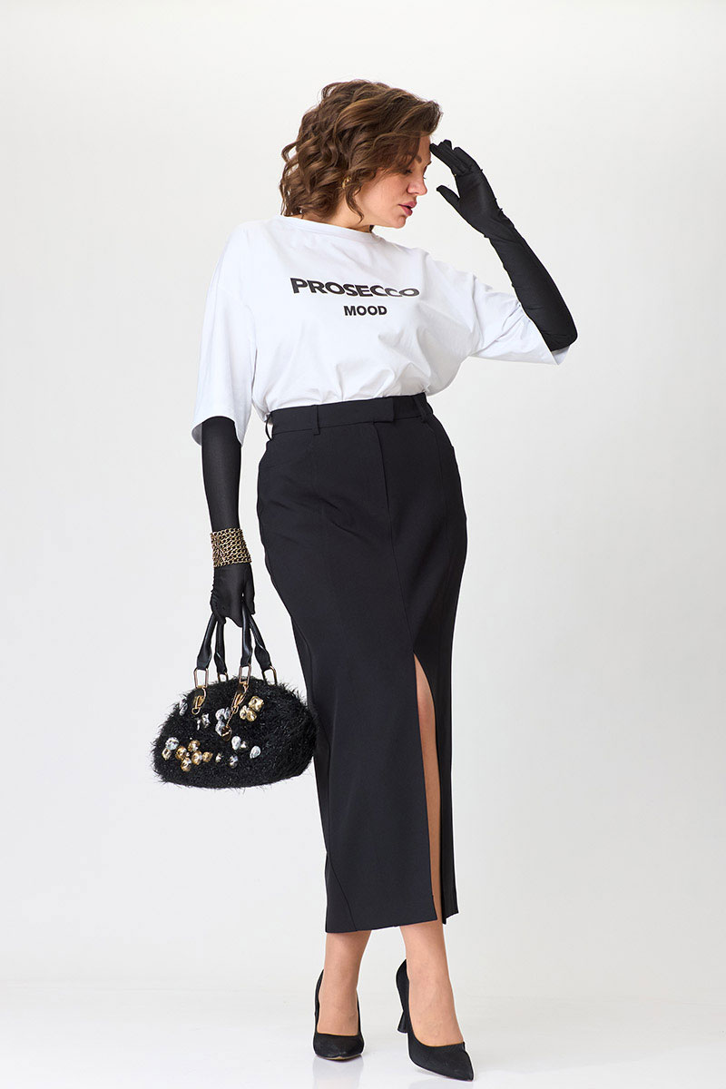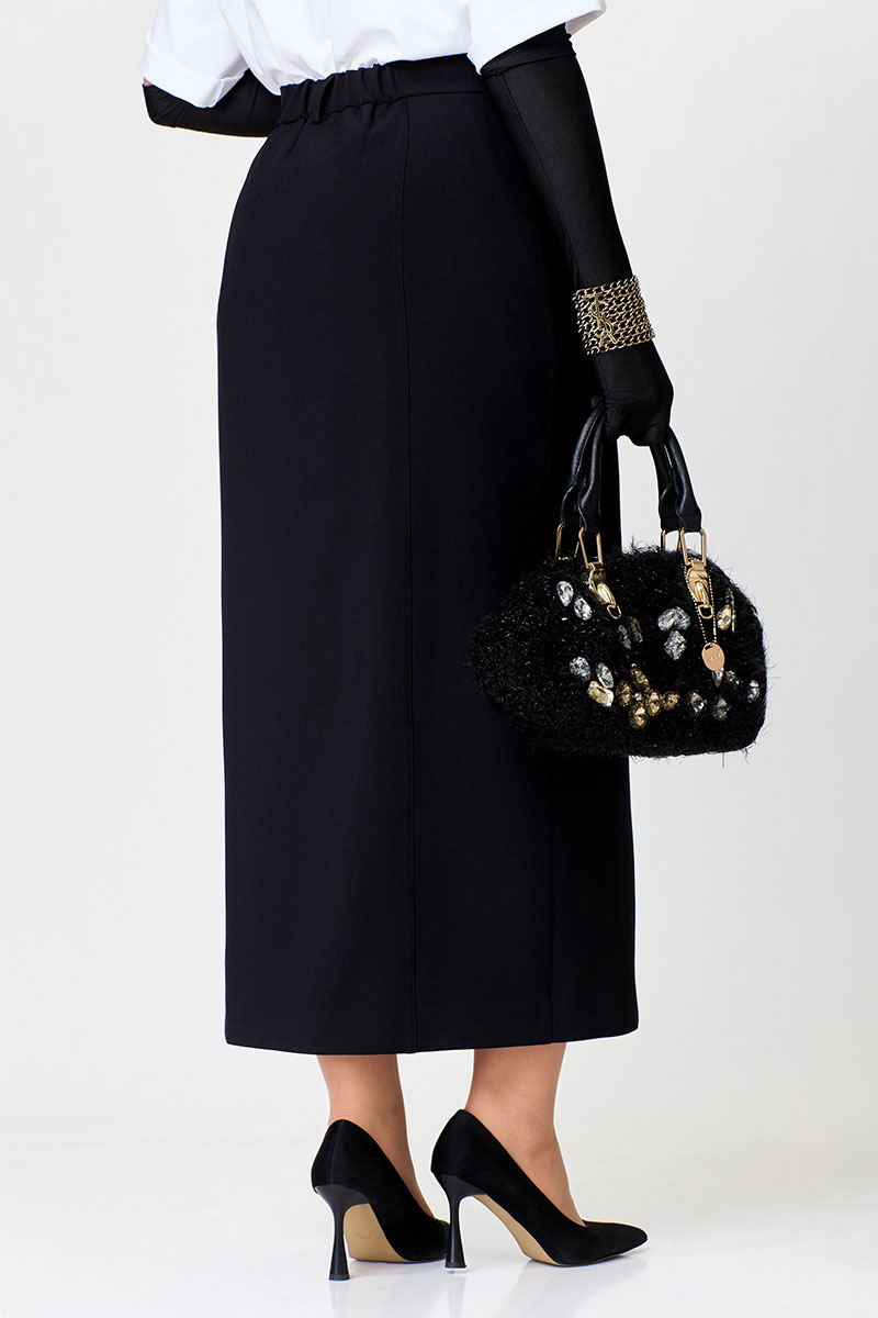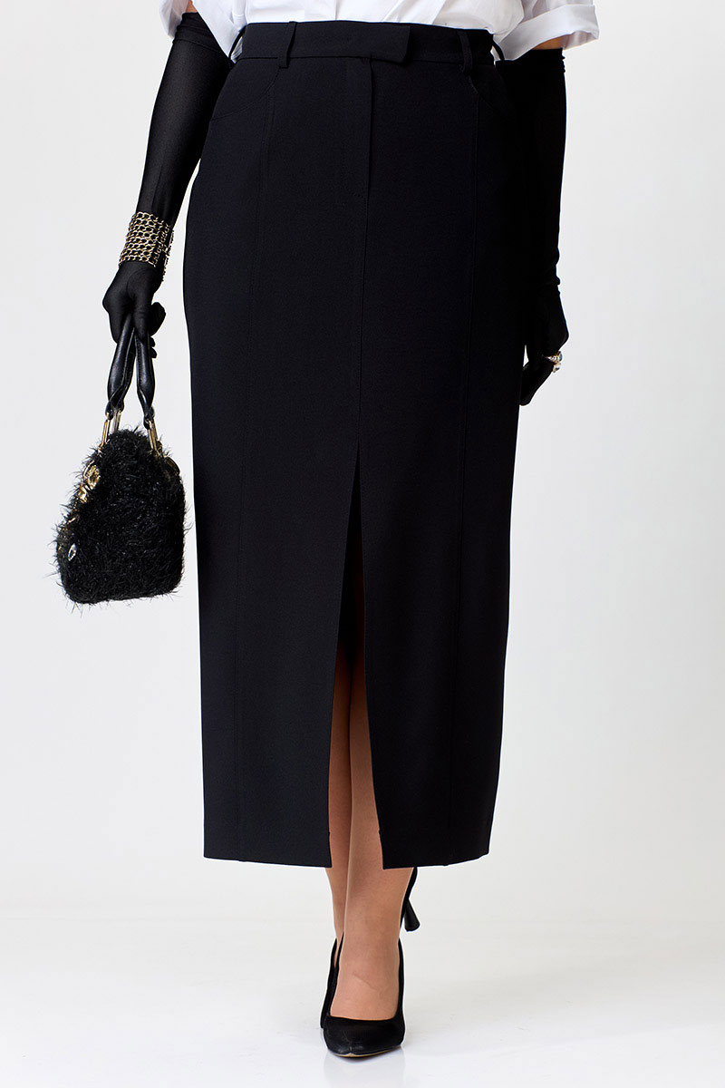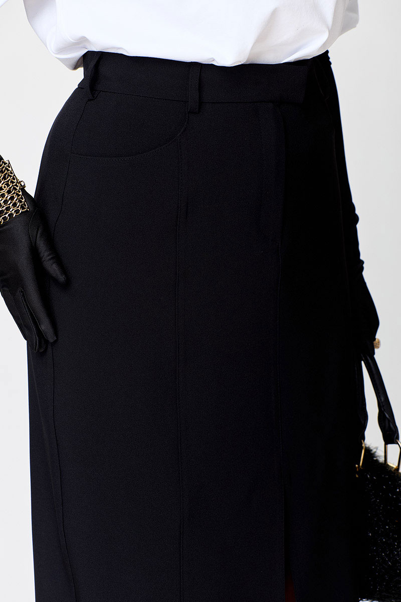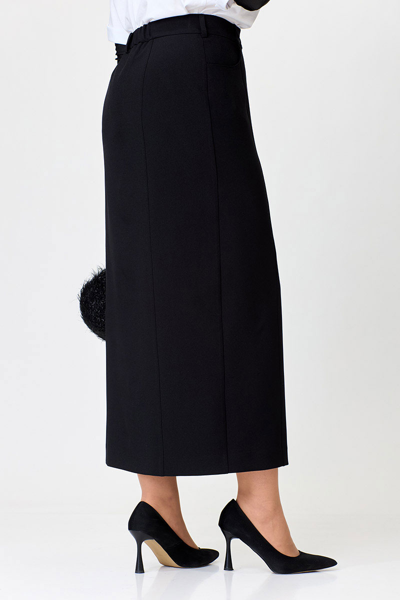 Элегантная чёрная юбка – модная классика, которая не может отсутствовать в гардеробе шикарной женщины. Независимо от того, готовите ли вы наряд для офиса, наряд для похода в театр или комплект для семейной встречи, идеально сшитая юбка дополнит ваш образ. Юбка классической формы, длиной maxi, cлегка заужена к низу. Верхний срез обработан притачным поясом с резинкой, идущей от бокового шва и по задним половинкам. Перед состоит из 4 частей, рельефы отстрочены декоративной строчкой. По низу центрального рельефа - разрез. В верхней части переда обработаны фигурные карманы. Застежка по переду — на тесьму молнию, потайную пуговицу и крючок. Спинка юбки состоит из центральной части и бочков, с отстроченными отделочной строчкой рельефами.