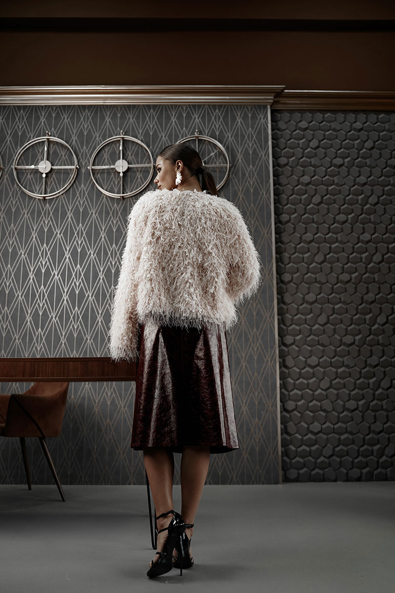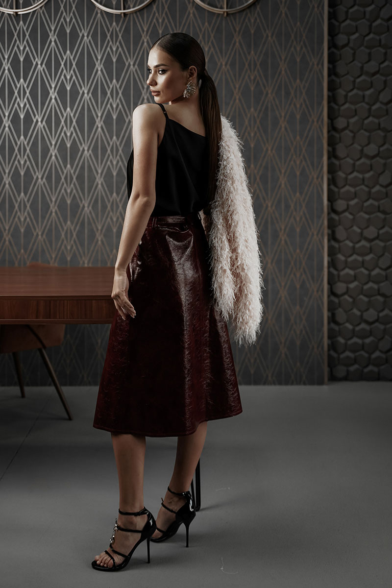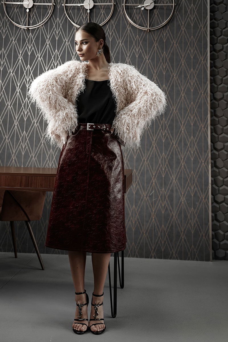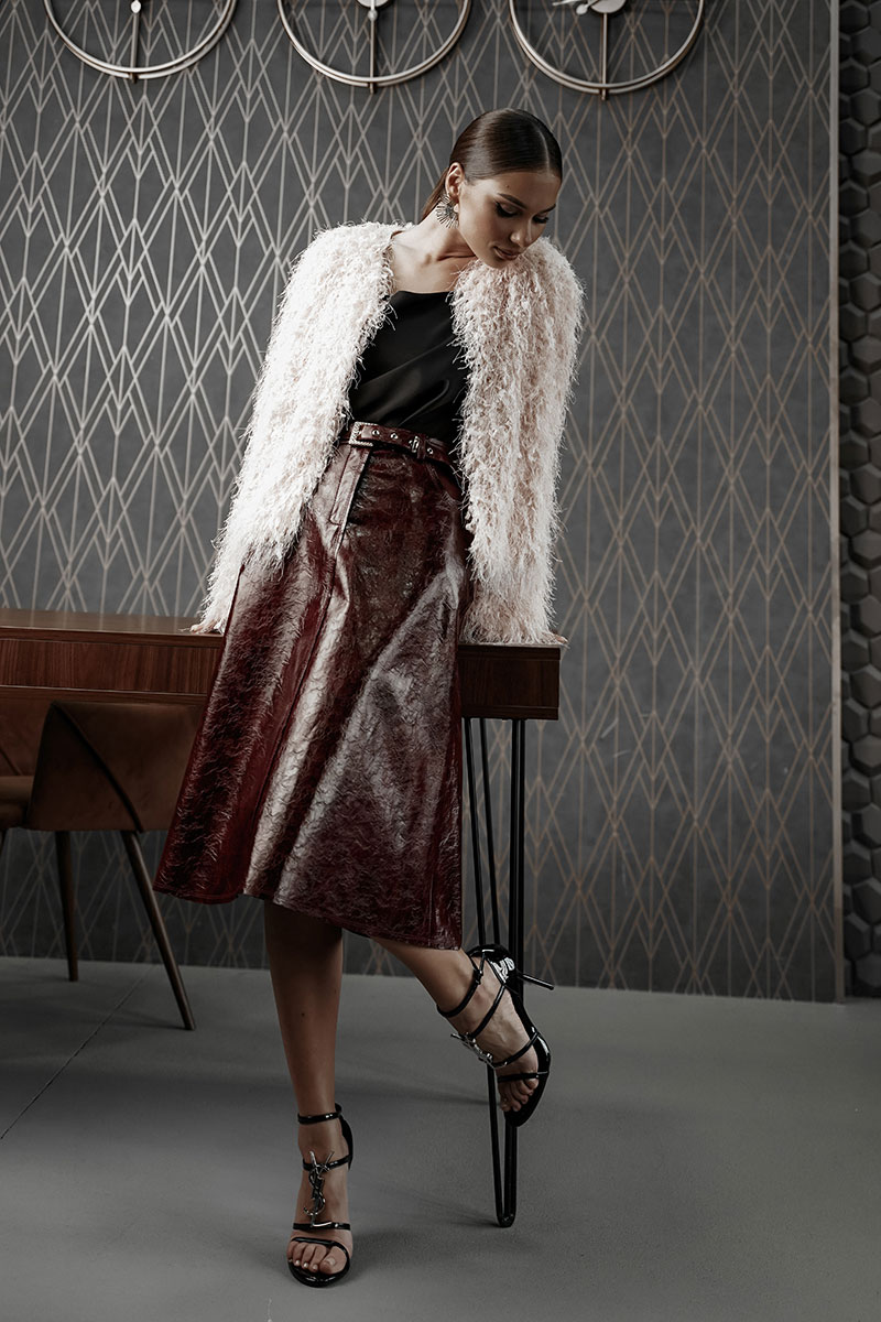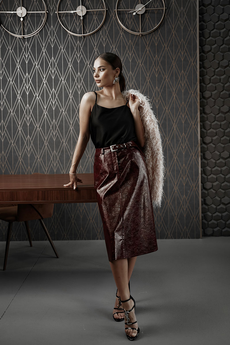 Юбка женская из трендовой фактурной экокожи на подкладке, длиной чуть ниже колена, пояс притачной, спереди застежка на молнию и кнопку и боковые карманы, в комплекте ремень из оригинальной ткани с декоративной пряжкой. Вертикальные швы, карманы и низ юбки обработаны «открытым» швом.