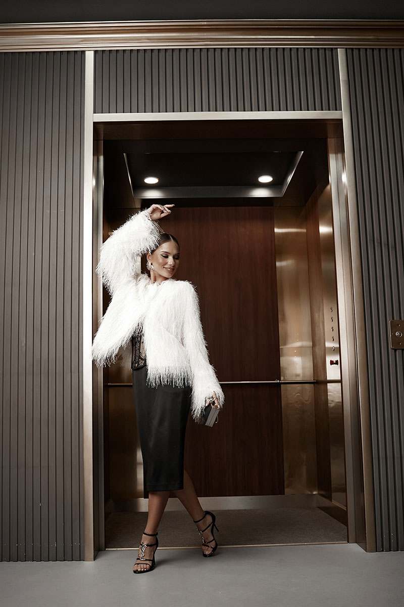 Юбка из атласной ткани, зауженная к низу, ниже колена. Пояс цельнокроеный, застежка по центру заднего полотнища на потайную молнию, по низу разрез. Юбка на подкладке.