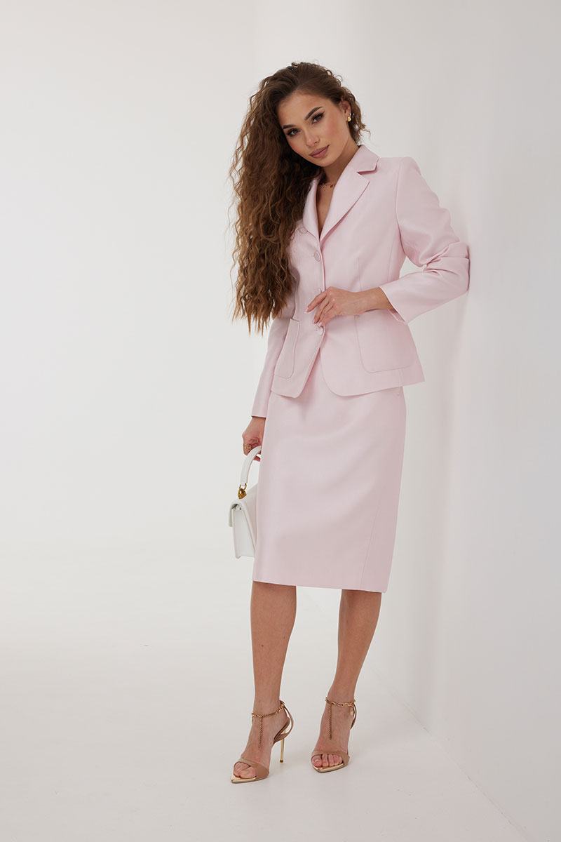 Юбка из костюмно-плательной ткани, зауженная к низу, ниже колена. Пояс цельнокроеный, по переду боковые карманы, застежка по центру заднего полотнища на потайную молнию, по низу разрез. Юбка на подкладке.