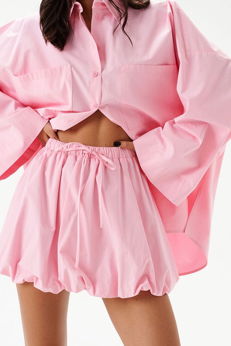 Юбка-мини. Выполнена из хлопковой ткани нежно-розового цвета. Характеристики: пояс на резинке с кулиской, подкладка, низ изделия на резинке.
