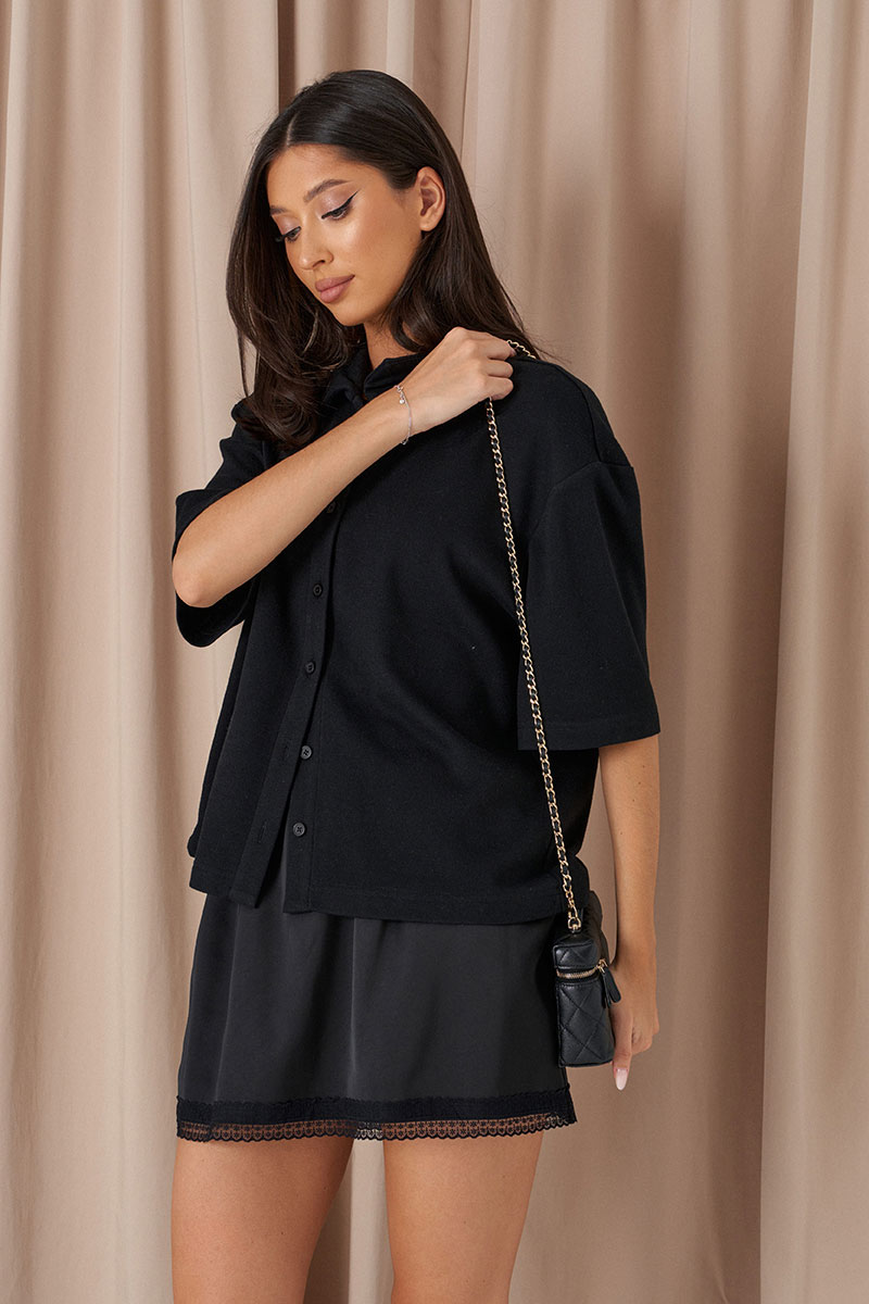 Юбка полуприлегающего силуэта выполнена из струящегося полотна черного цвета на брендированной подкладе. Характеристики: полуприлегающий силуэт, пояс на резинке, по низу изделия пришито кружево.