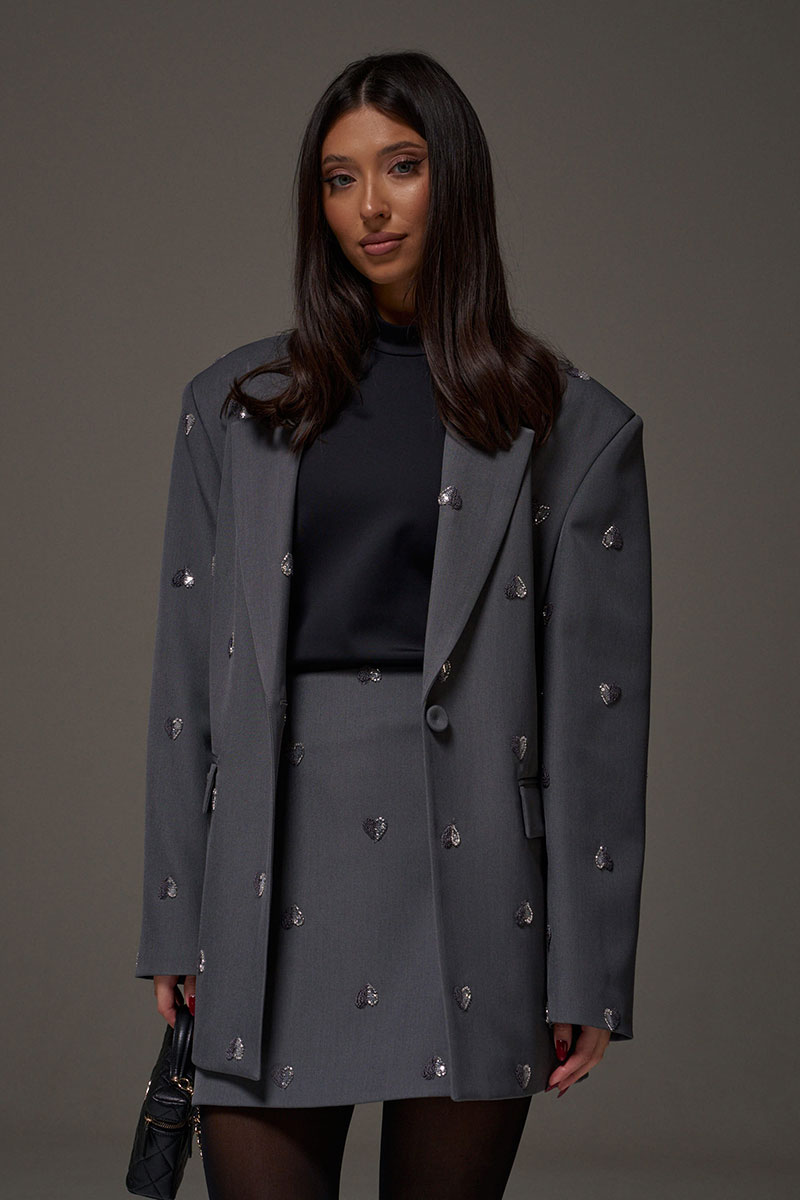 Юбка-мини прямого кроя. Выполнена из костюмной ткани серого цвета, декорированной сердечками. Силуэт - трапеция, брендированная подкладка. Застежка - потайная молния в шве заднего полотна изделия.