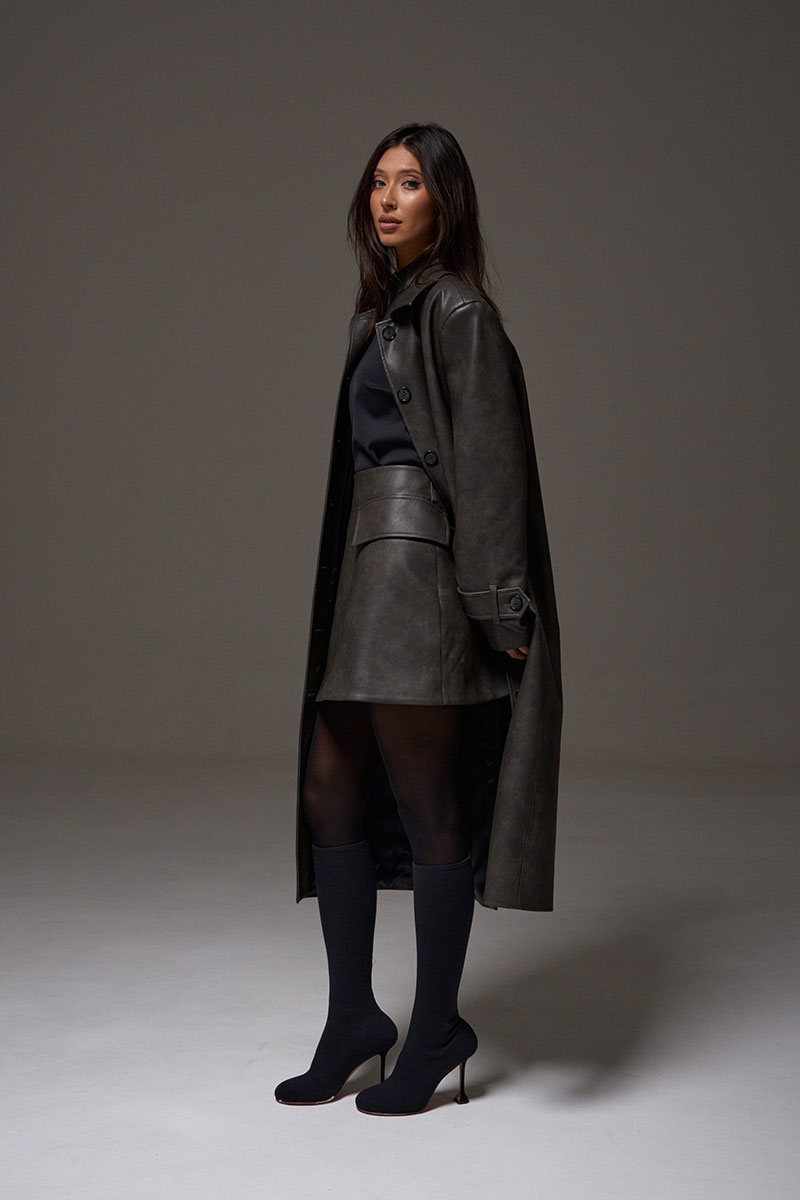 Юбка полуприлегающего силуэта, выполнена из экокожи. Характеристики: полуприлегающий А - образный силуэт, на брендированной подкладке, застежка - потайная тесьма молния в среднем шве заднего полотна, по переду имитация карманов с клапаном.