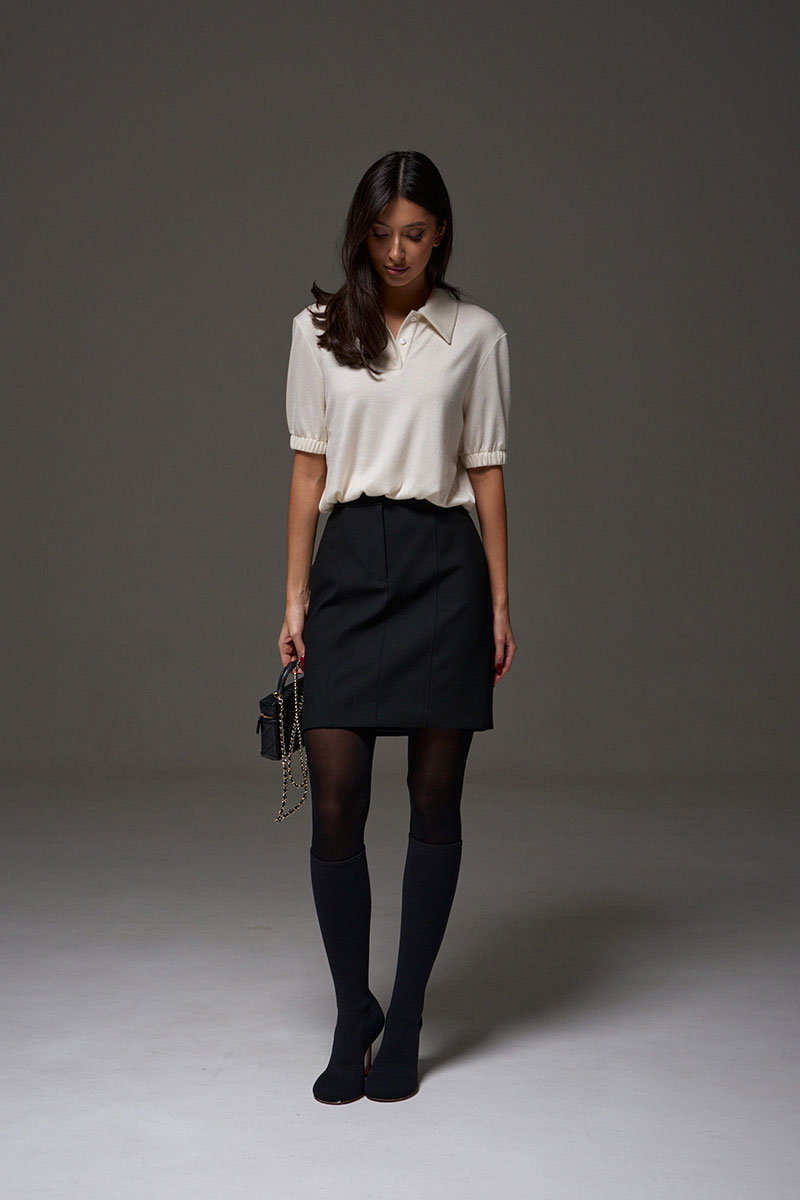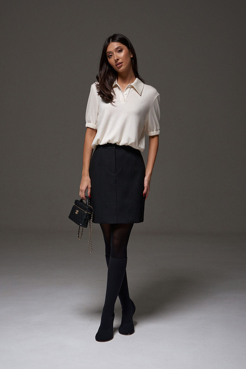 Юбка прямого кроя выполнена из текстильного полотна черного цвета. Характеристики: прямой крой, брендированная подкладка, пояс стабильный, застежка молния и пуговичка, по передней и задней части изделия вертикальные прямые рельефы.