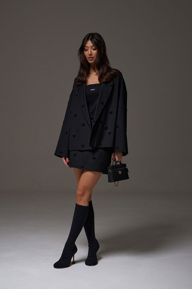 Юбка-мини прямого кроя выполнена из костюмной ткани черного цвета, декорированной черными сердечками. Характеристики: силуэт - трапеция, брендированная подкладка, застежка - потайная молния в шве заднего полотна изделия.
