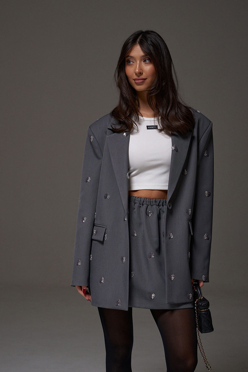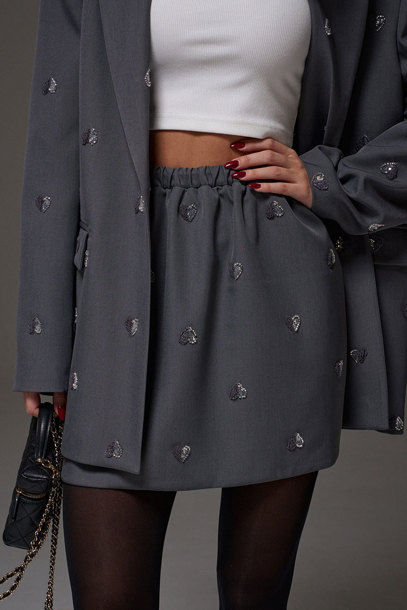 Юбка прямого кроя, выполнена из костюмной ткани серого цвета, с декоративной вышивкой в виде сердечек. Характеристики: прямой крой, на брендированной подкладке, пояс на резинке.