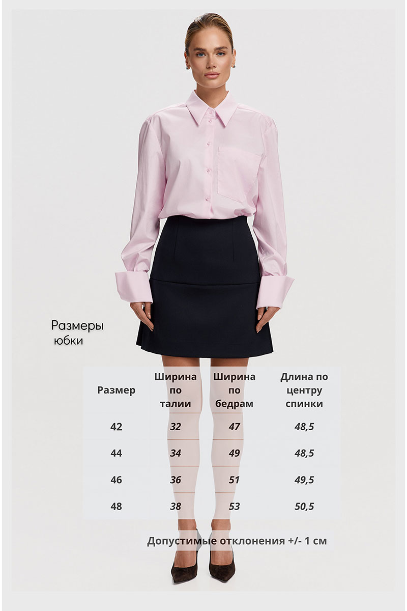 Юбка А-силуэта с двумя встречными складками по бокам добавляет свободу движений и современный акцент. Выполнена из премиального текстильного полотна из шерсти и вискозы. Юбка длиной мини, отрезная по линии бёдер, на подкладке. Потайная молния в боковом шве. Эта юбка станет идеальным выбором для создания как деловых, так и повседневных образов, сочетая комфорт и безупречный стиль. Измерения готового изделия расположены в табличке с фотографиями. Параметры модели на фото (см): 90/65/95, размер: 44/S, рост: 175 см.