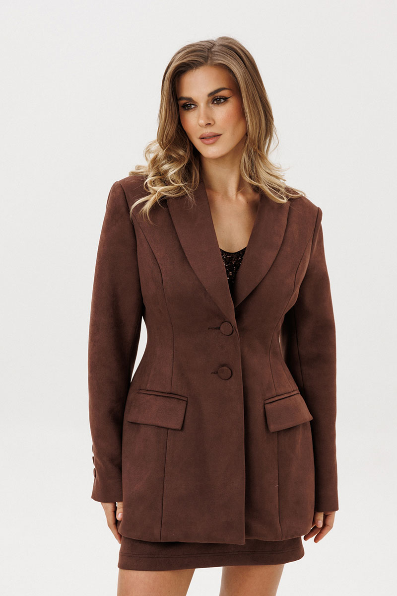 Юбка выполнена из плотной искуственной замши. Юбка прямого силуэта, длиной выше линии колена. Переднее полотнище цельное. Сзади в среднем шве застежка на потайную молнию.