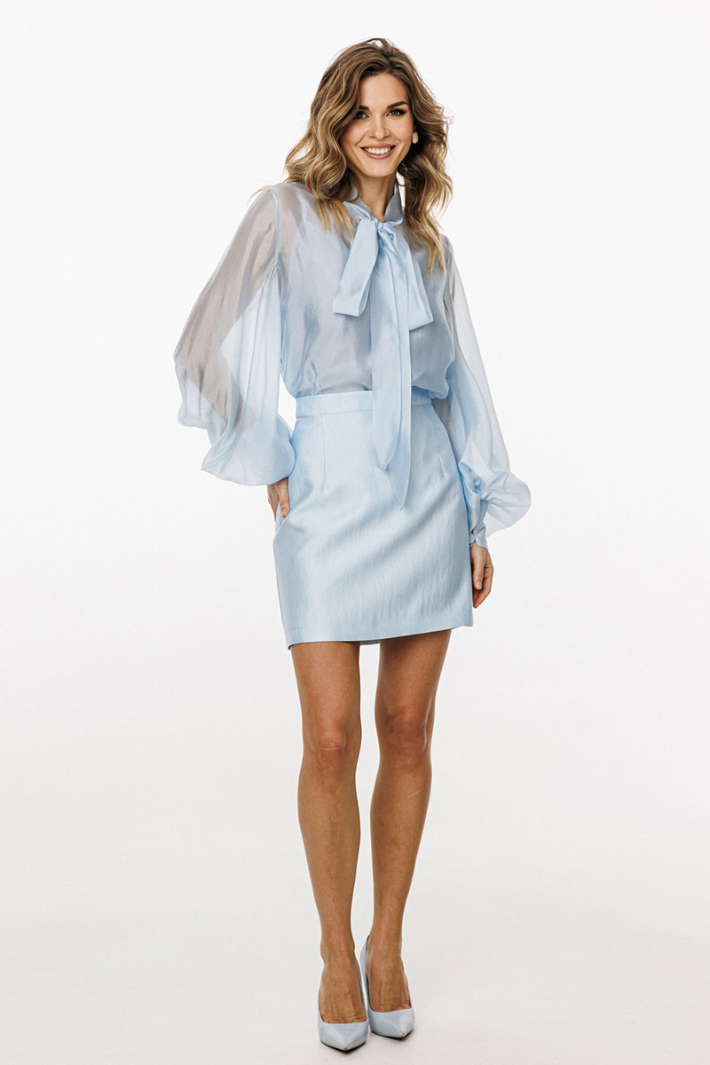Юбка выполнена из костюмной ткани. Юбка прямого силуэта, длиной выше линии колена. Переднее полотнище цельное. Сзади в среднем шве застежка на потайную молнию.