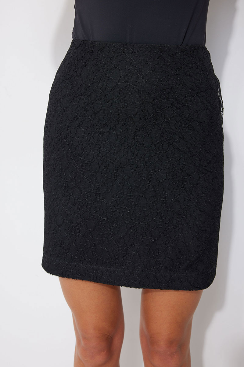 Нарядная мини-юбка. Верхний слой юбки выполнен из кружевной ткани. Нижний слой юбки - плотная струящаяся ткань. С потайной молнией в среднем шве заднего полотнища.