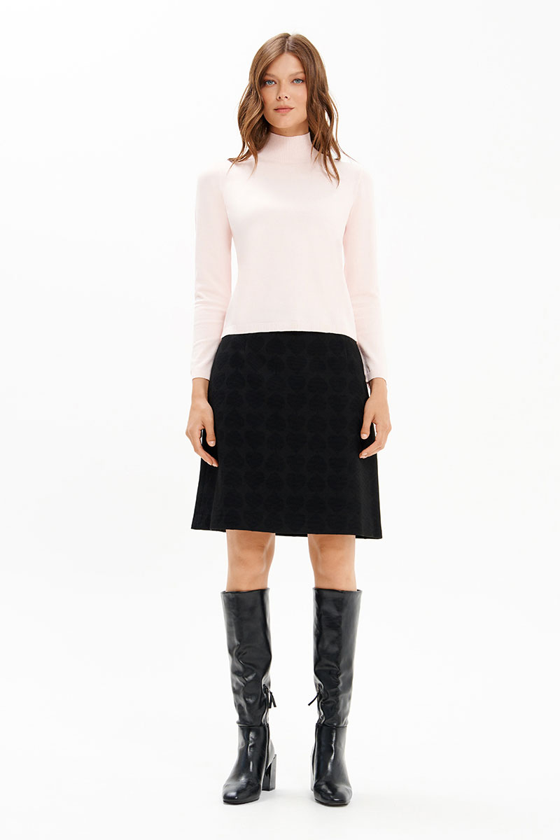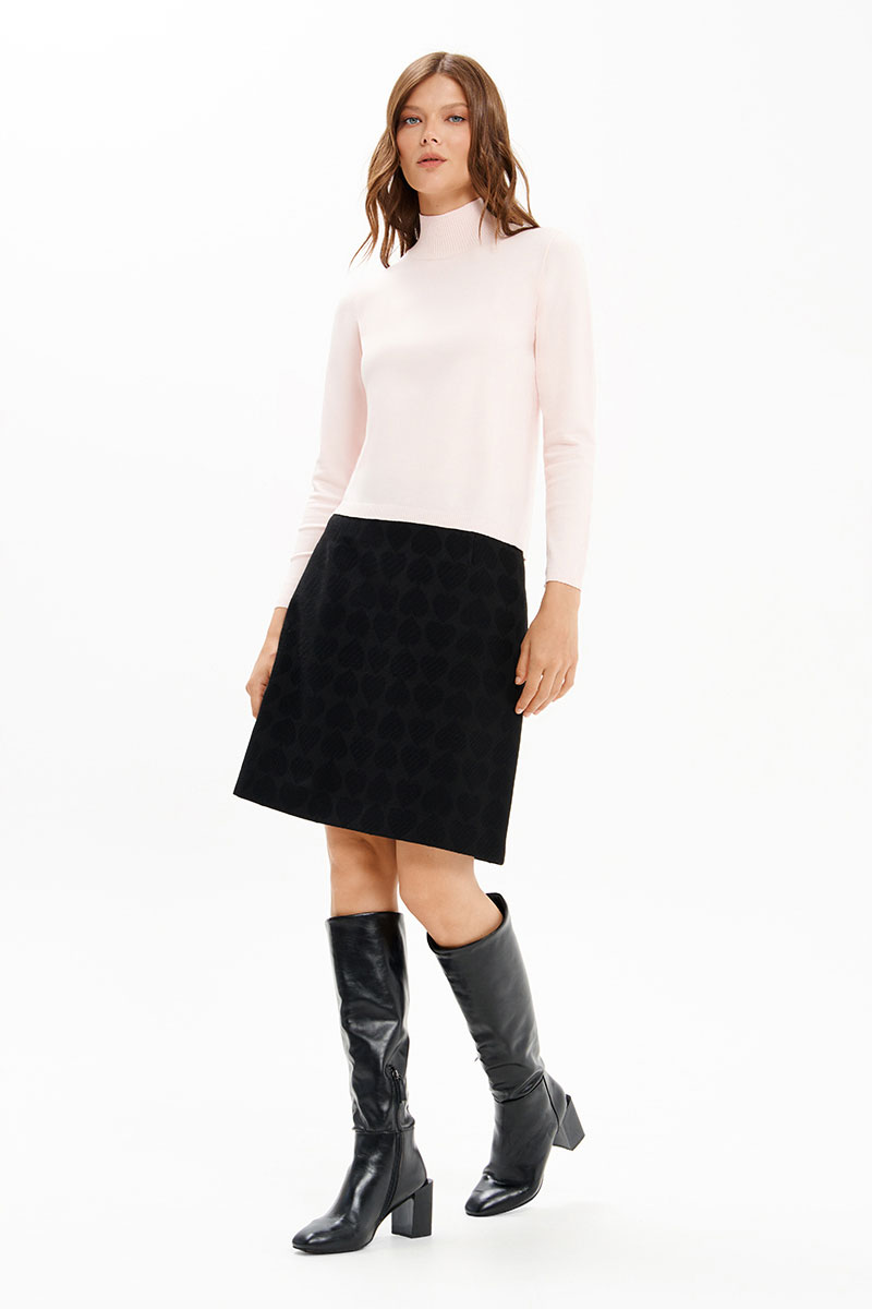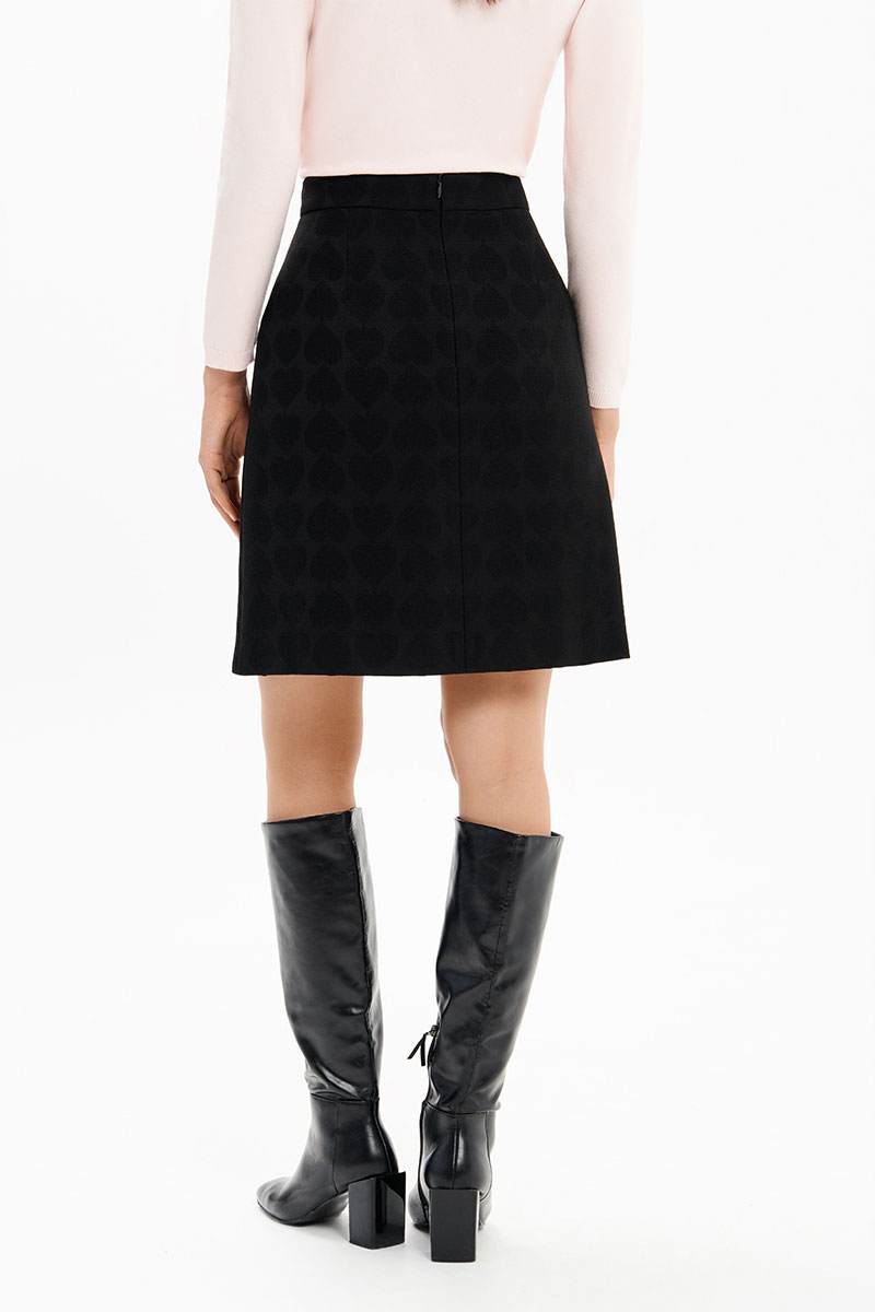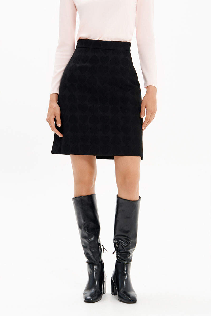 Черная юбка лаконичной длины выше колена, выполненная в сдержанной и концептуальной манере. Главным акцентом модели становится графичный принт, где классический мотив сердечек переосмыслен в ключе современной абстракции, создавая сложный и интеллектуальный визуальный ритм. Такой дизайн позволяет модели балансировать на грани строгости и тонкой, ироничной выразительности. Юбка станет ключевым элементом в гардеробе для тех, кто ценит нестандартные детали и умеет создавать образы с историей. Она идеально дополнит монохромный ансамбль с водолазкой и структурированным жакетом, добавляя ему художественной глубины и индивидуальности. С любовью и заботой о Вас, команда брендов NELVA и FRIDAY by NELVA!