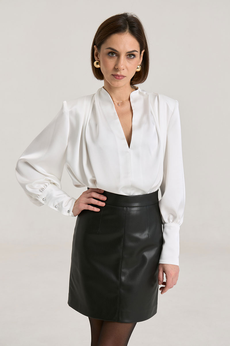 Юбка прилегающего силуэта на притачном поясе, посадка высокая, юбка на подкладке.В среднем шве застежка на потайную молнию. Юбка выполнена из мягкой экокожи, образ можно дополнить жакетом арт. 2332.