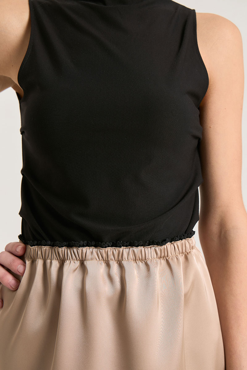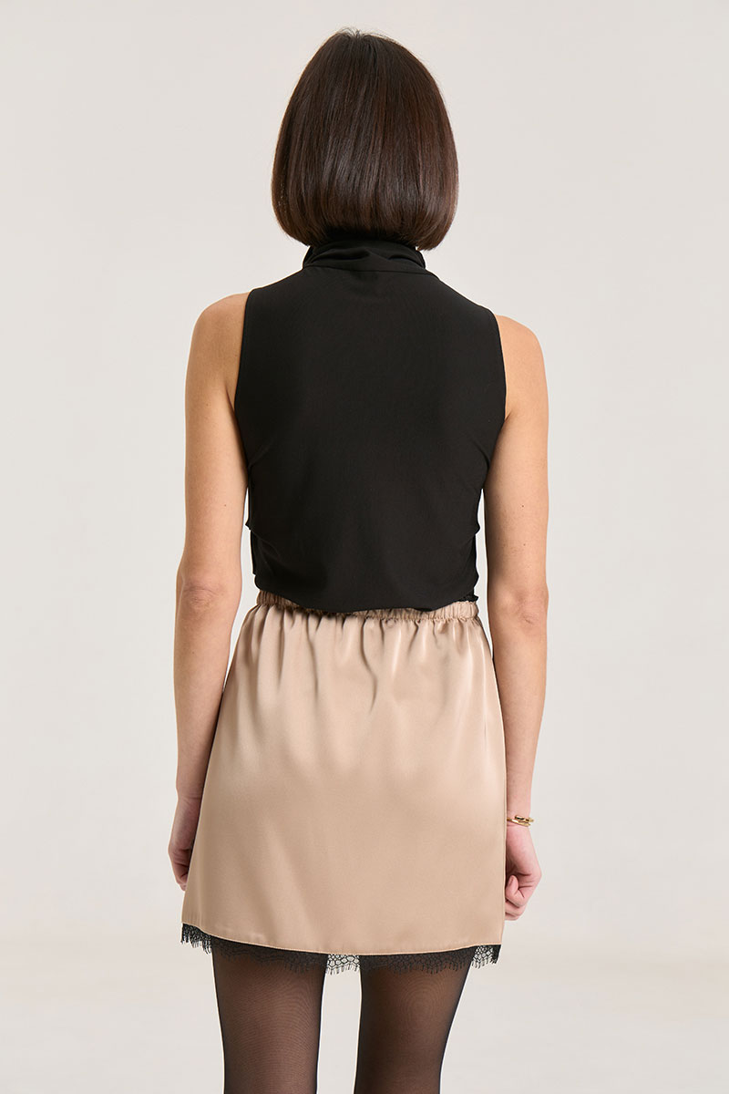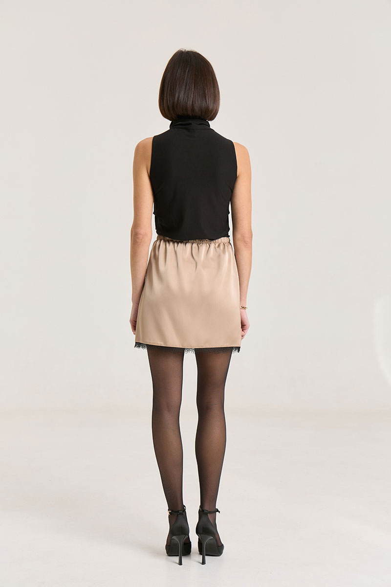 Атласная мини-юбка прямого кроя, на резинке, по низу кружево, пояс обработан декаративной тесьмой. Атлас плотный, не просвечивает. Юбку можно носить с топами, свитерами, жакетами, рубашками в любое время года.