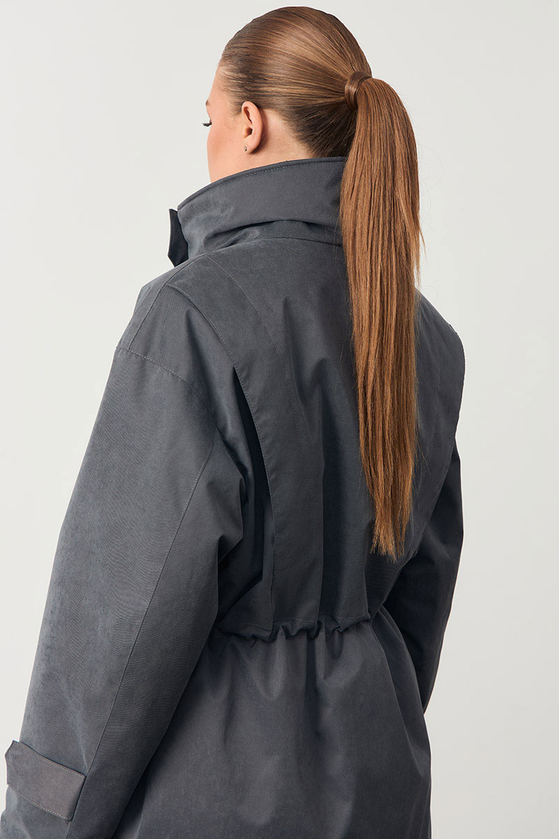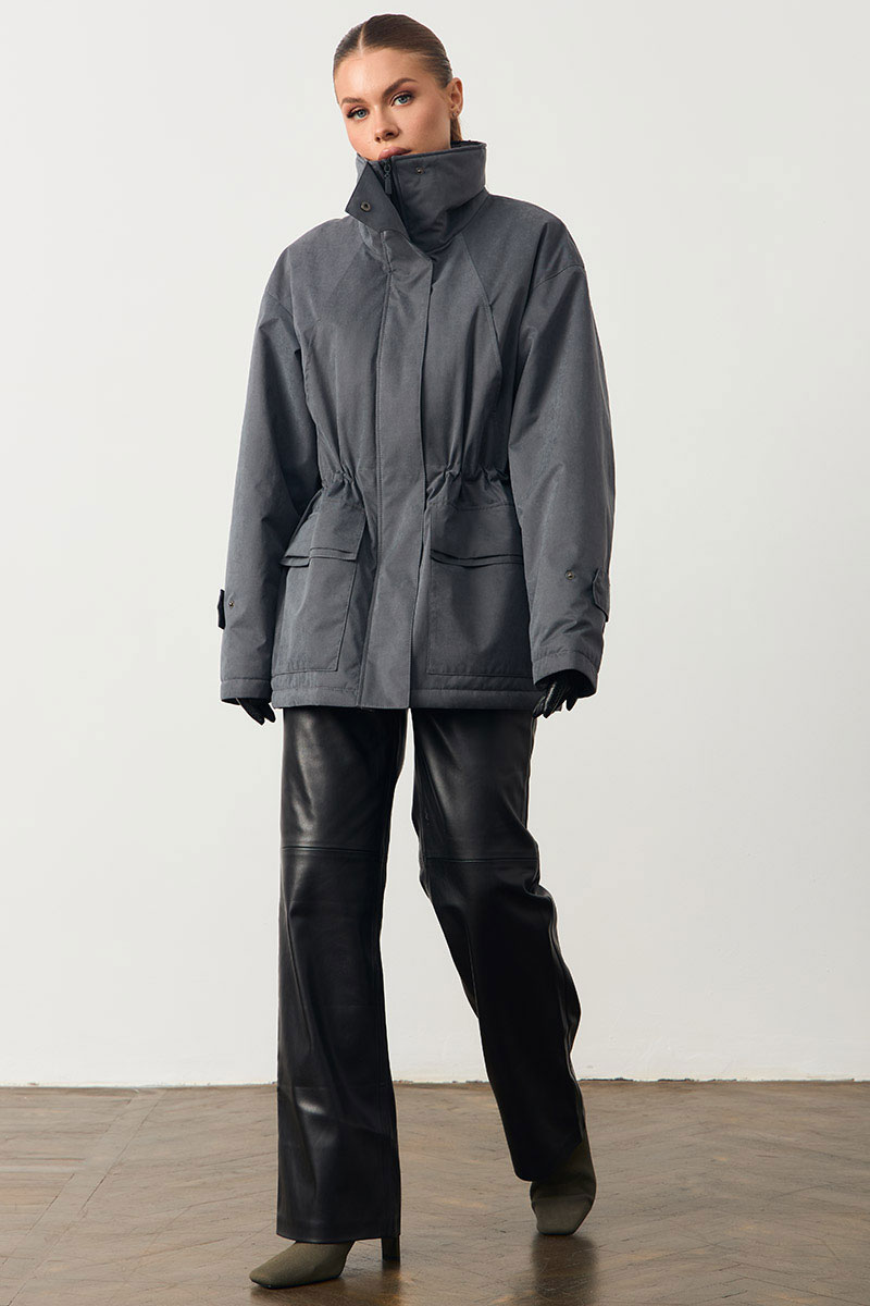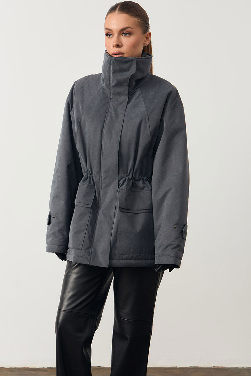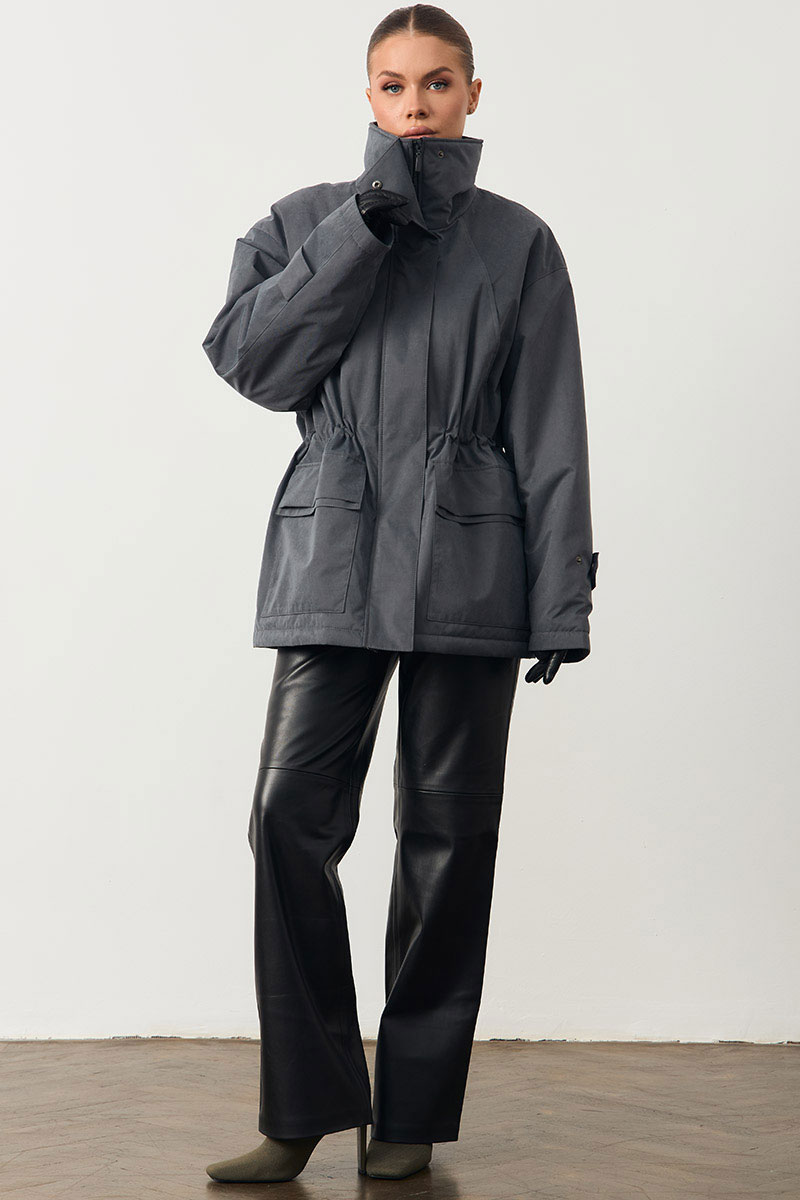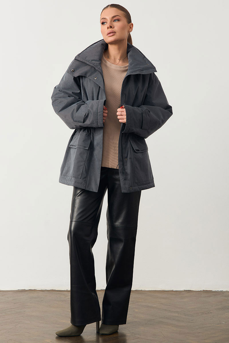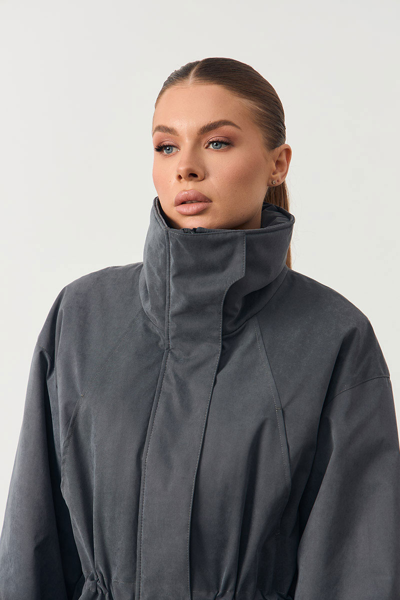 Женская куртка с высоким воротом. На поясе кулиска. Изделие прямого кроя.