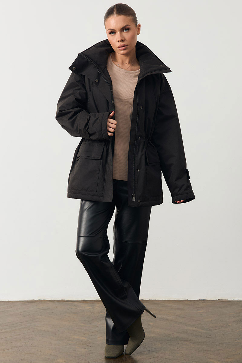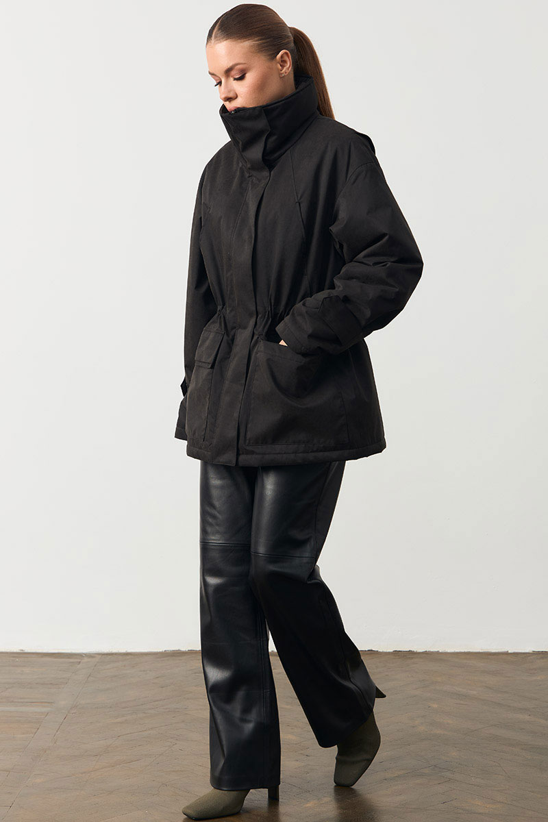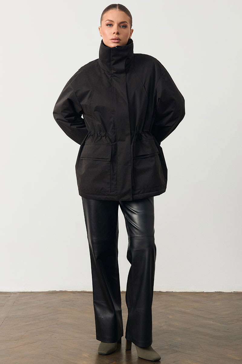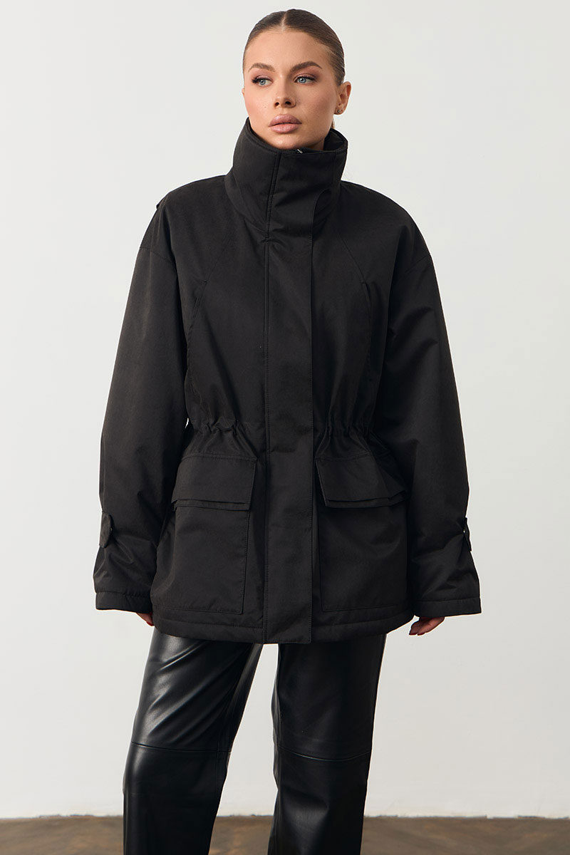 Женская куртка с высоким воротом. На поясе кулиска. Изделие прямого кроя.
