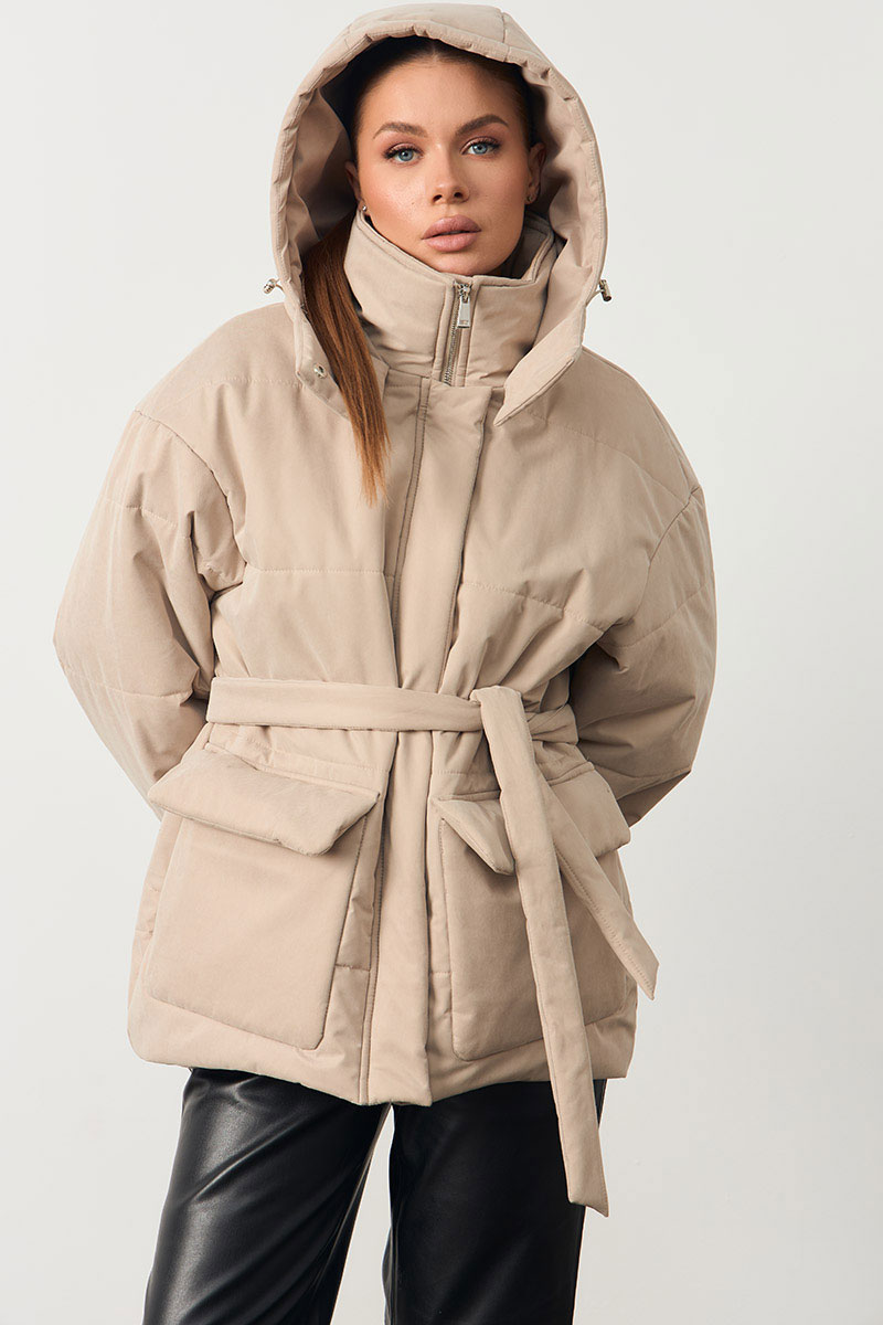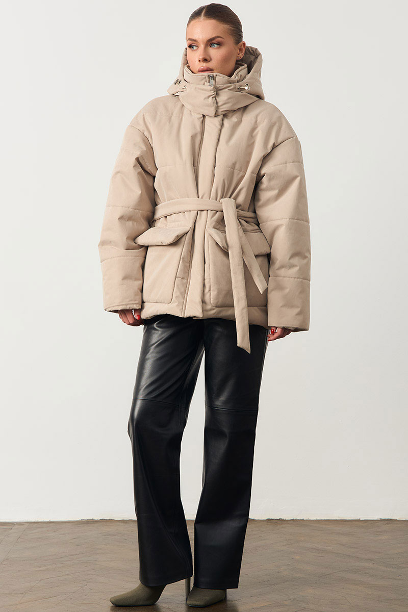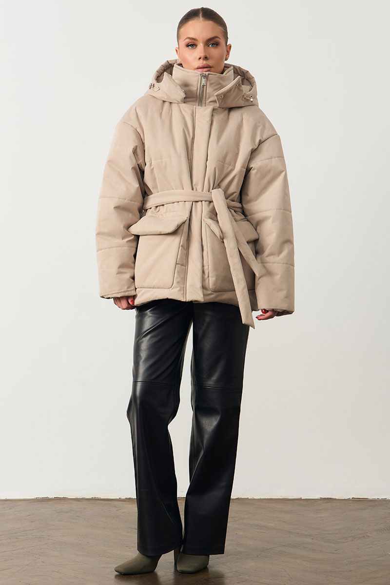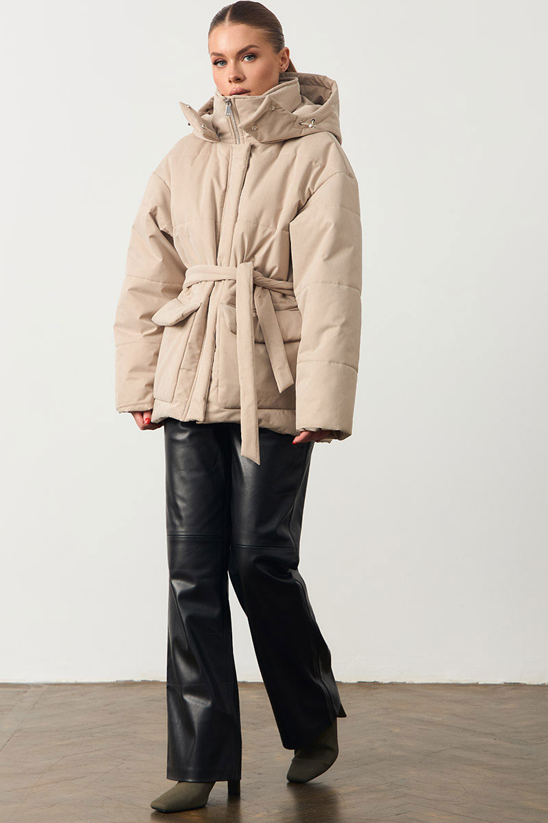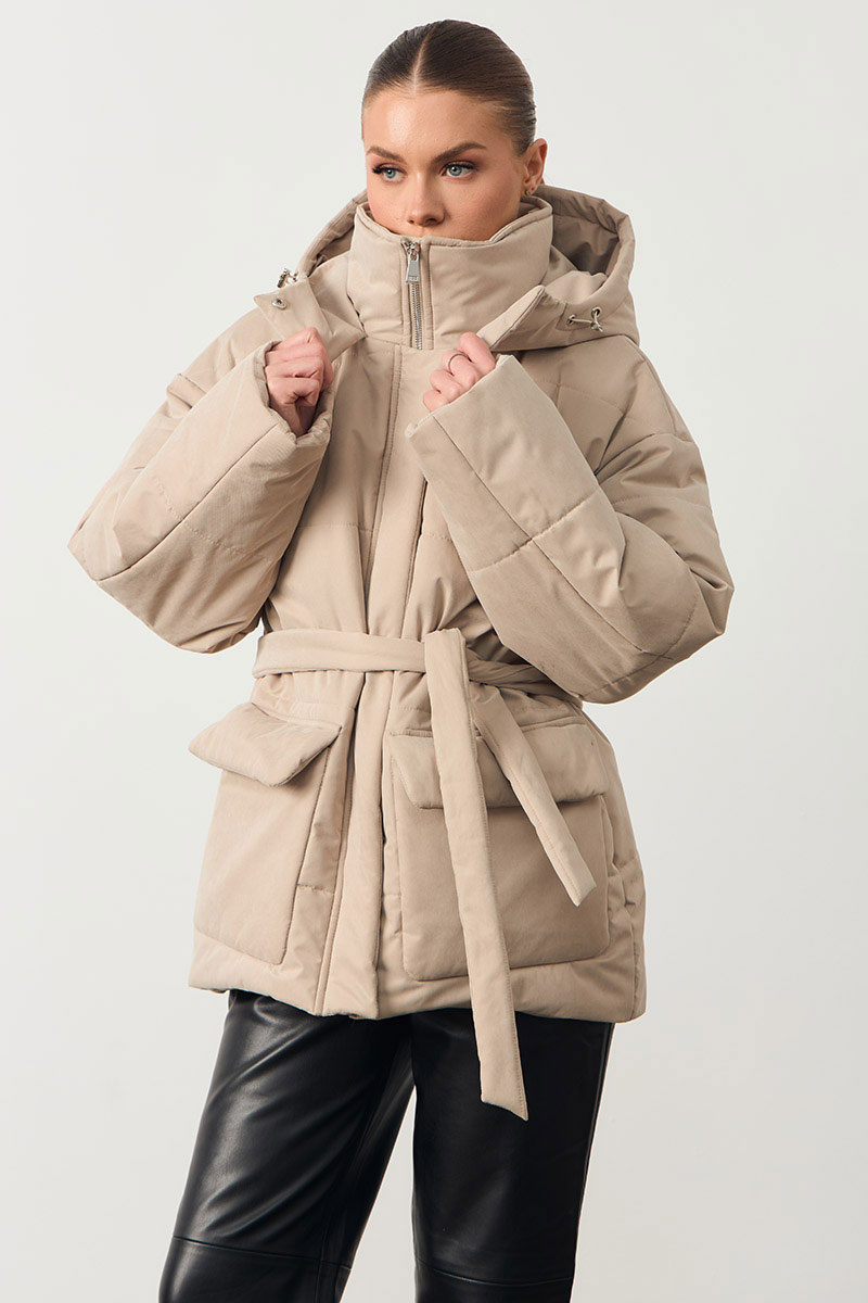 Женская осенняя куртка с капюшоном. Модель выполнена из водоотталкивающего материала. Изделие с утеплителем. Застежка тесьма-молния с планкой на кнопках. Капюшон съёмный. По переду изделия накладные карманы.