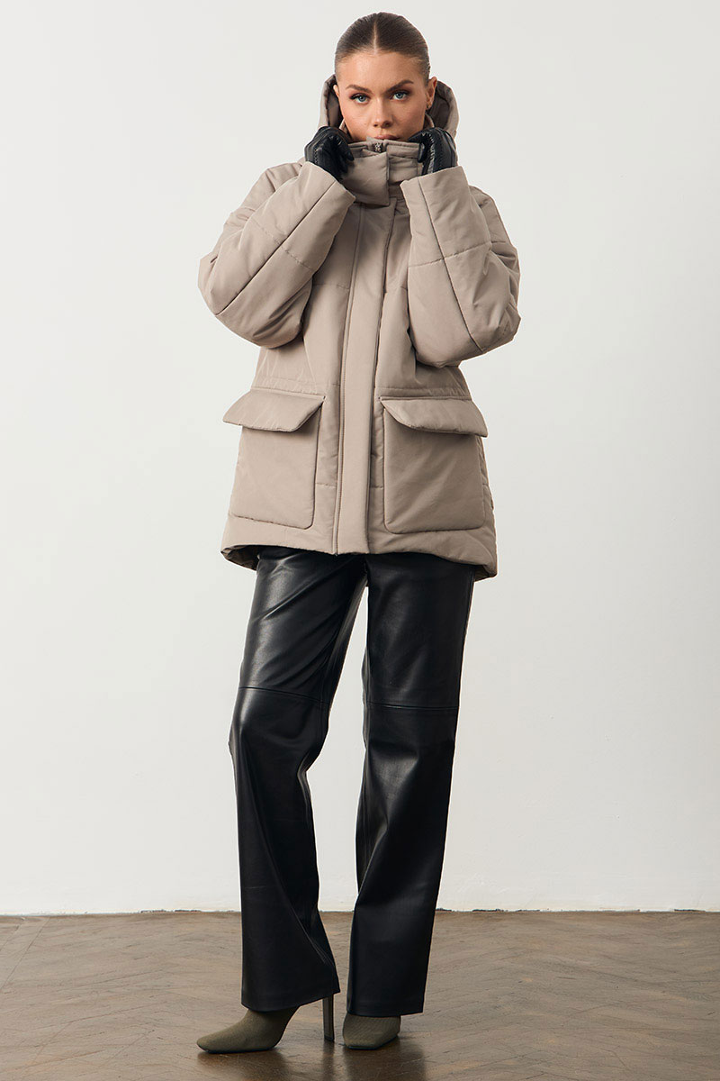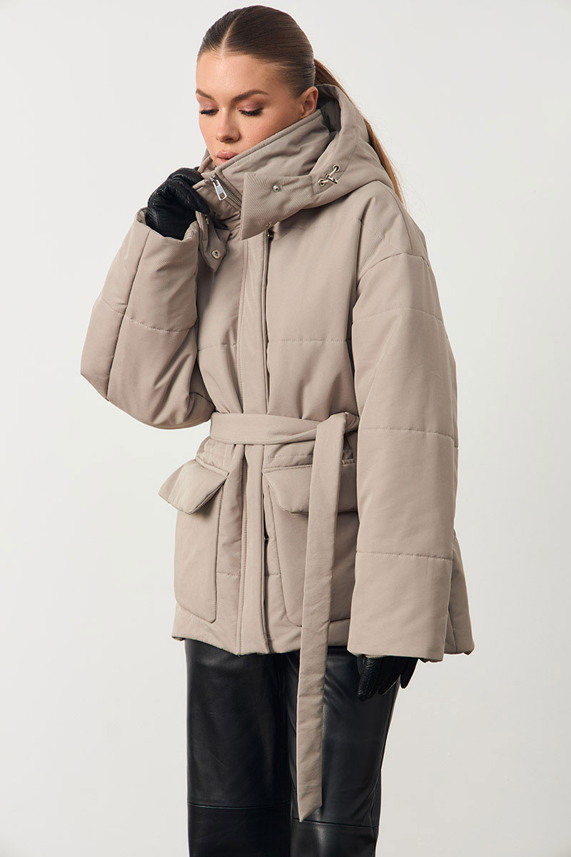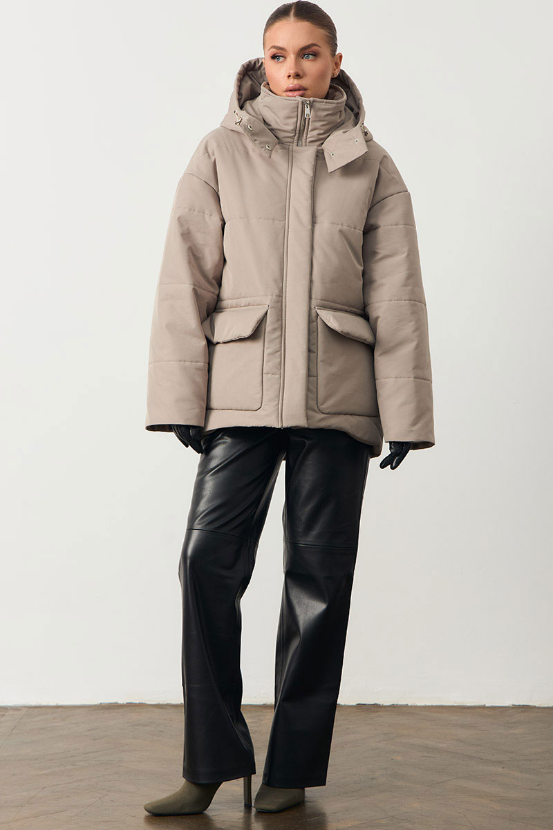 Женская осенняя куртка с капюшоном. Модель выполнена из водоотталкивающего материала. Изделие с утеплителем. Застежка тесьма-молния с планкой на кнопках. Капюшон съёмный. По переду изделия накладные карманы.