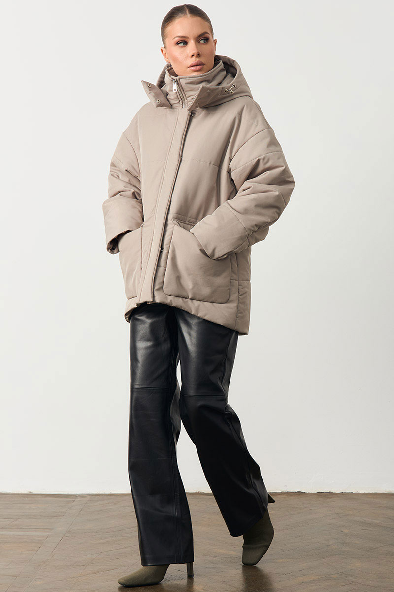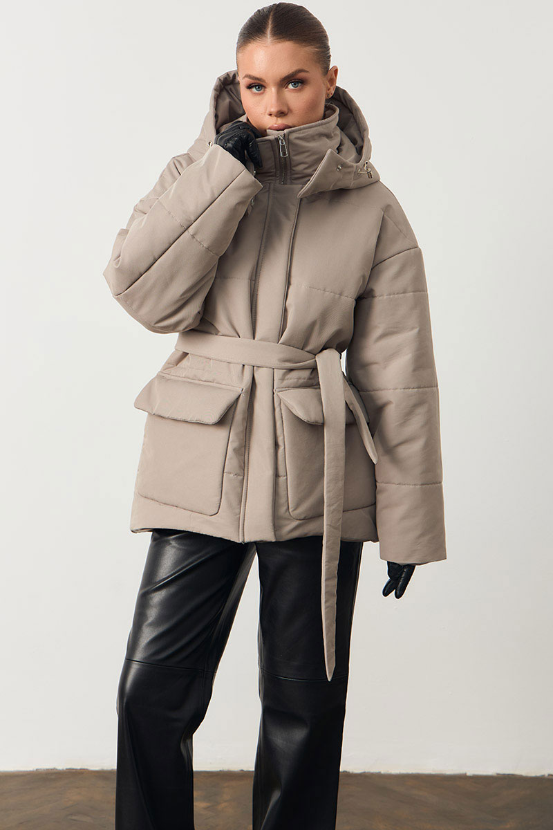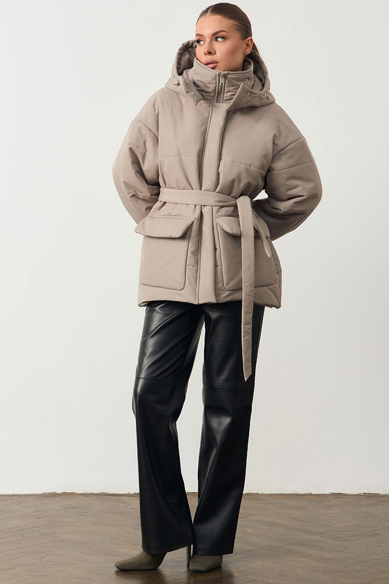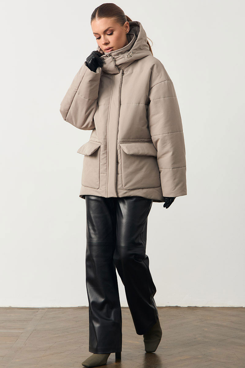 Женская осенняя куртка с капюшоном. Модель выполнена из водоотталкивающего материала. Изделие с утеплителем. Застежка тесьма-молния с планкой на кнопках. Капюшон съёмный. По переду изделия накладные карманы.