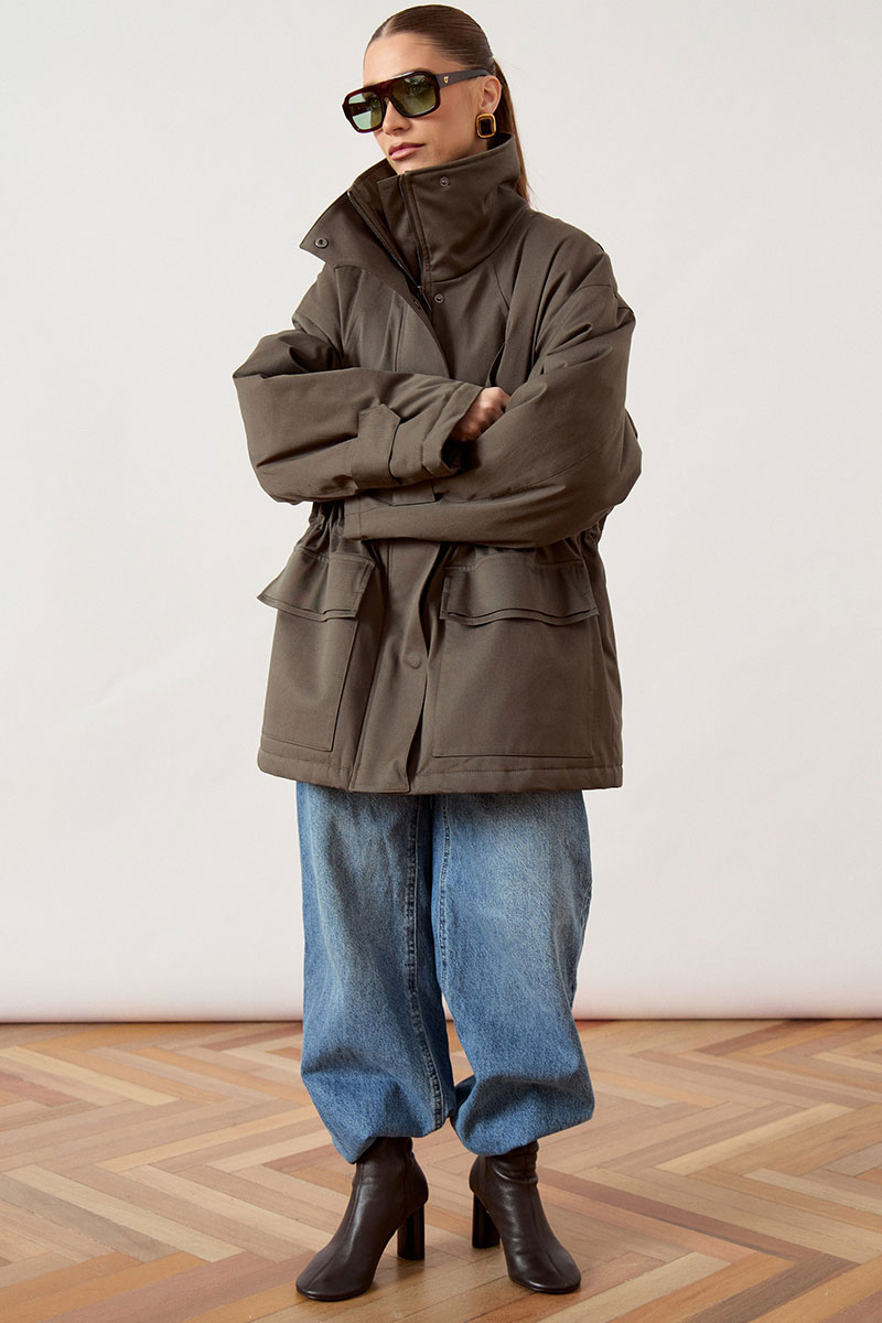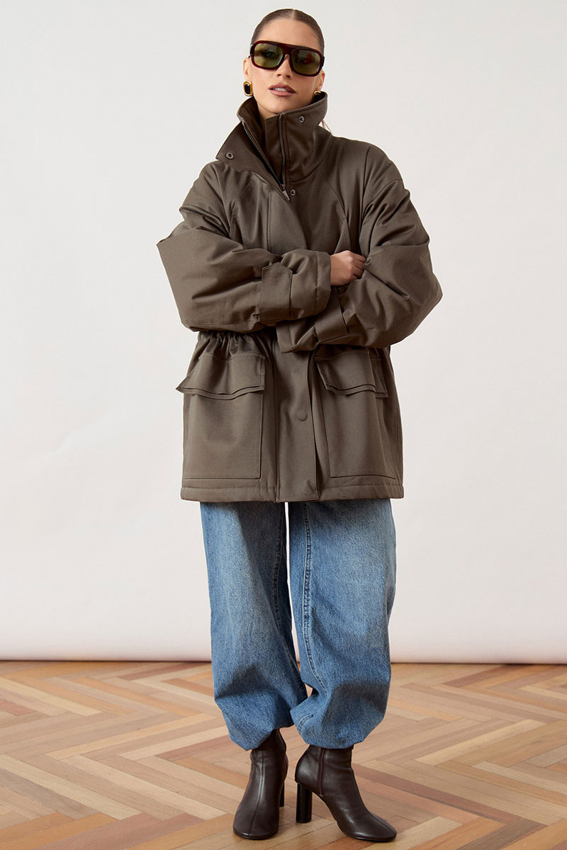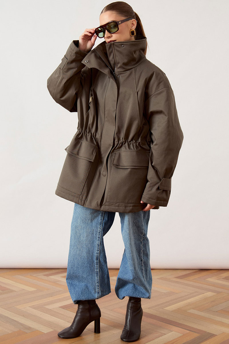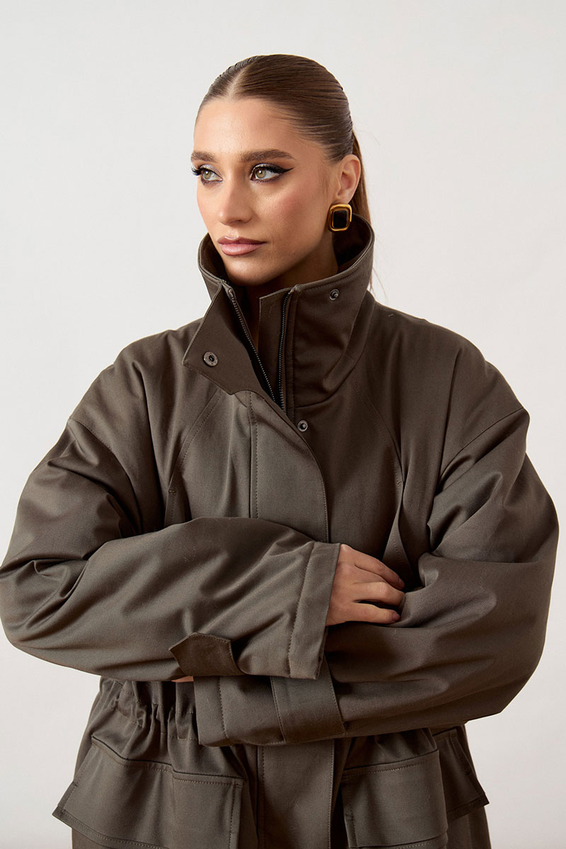 Куртка женская, прямого силуэта, из плотной ткани. Модель с высоким воротником-стойкой и центральной застежкой на молнию, закрытой широкой ветрозащитной планкой. Рукав покроя реглан, свободный, по низу дополнен декоративными патами на кнопках для регулировки объема. В области талии предусмотрена кулиска с эластичным шнуром. На уровне бедер расположены объемные накладные карманы с клапанами. Низ изделия ровный, обработан в подгибку.