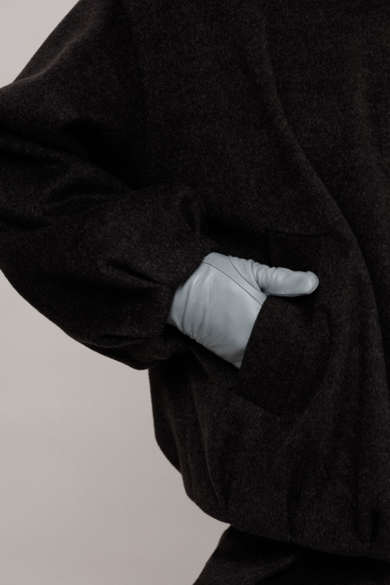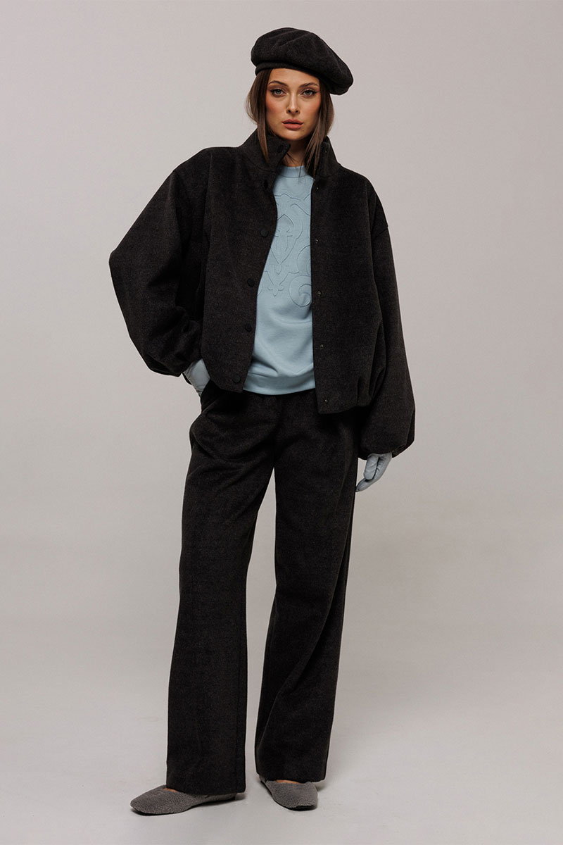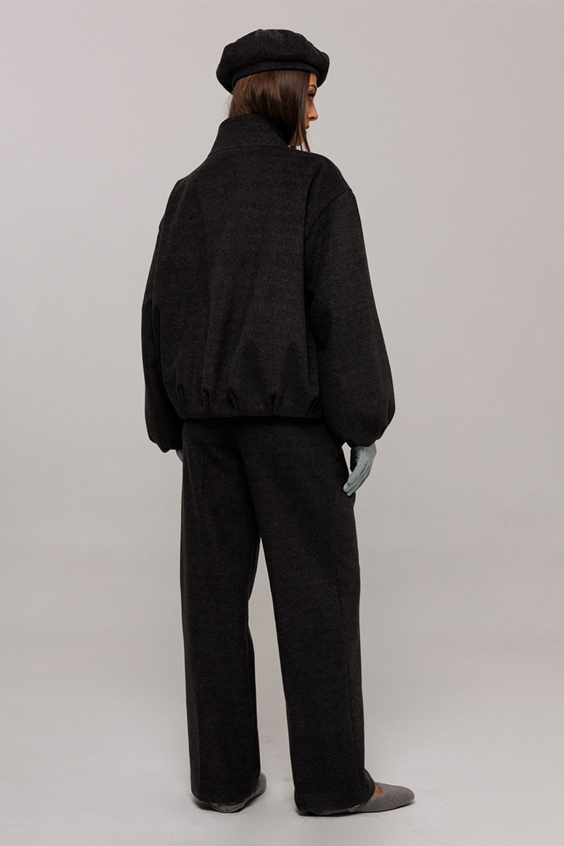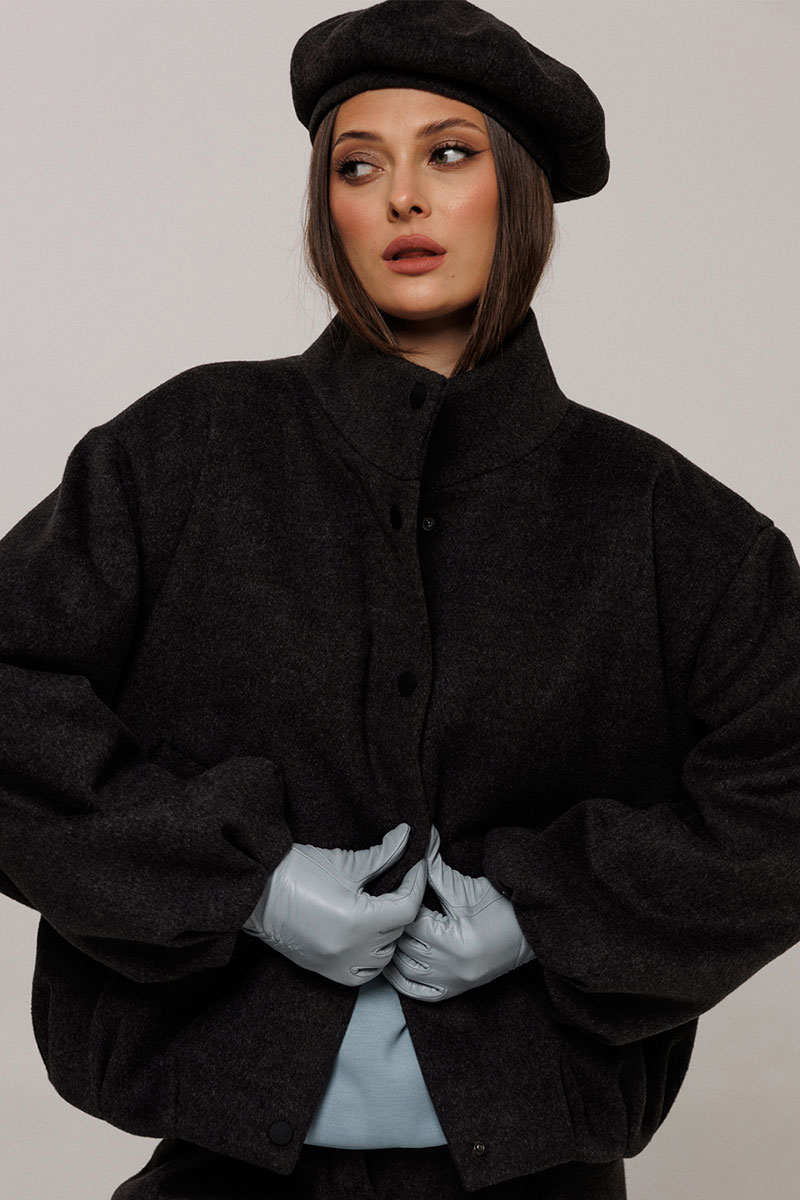 Куртка из пальтовой ткани прямого силуэта со спущенной линией плеча. Рукав втачной одношовнный внизу со складками. Полочка с центральной застежкой на кнопки и карманом-листочкой. Полочка и спинка внизу со складками. По горловине воротник-стойка с застежкой на кнопку. Куртка на подкладке.