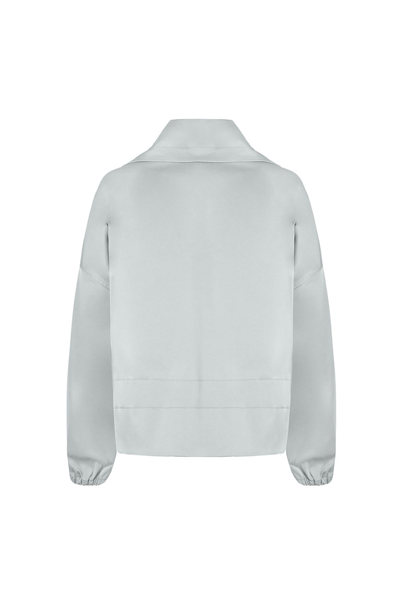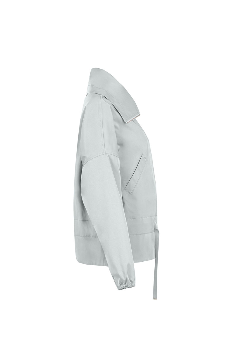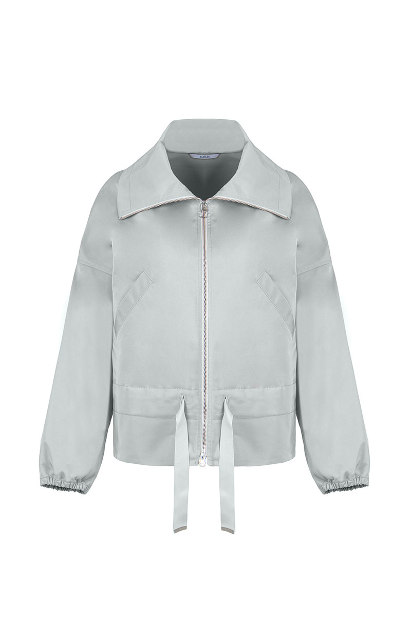 Куртка женская плащевая прямого силуэта длиной до середины бедра, без подкладки. На переде карманы с листочкой, застежка по борту на молнию. В нижней части изделия кулиса с тесьмой. Рукав длинный спущенный, по низу рукав, собран на резинку. Воротник – стойка, отложной.