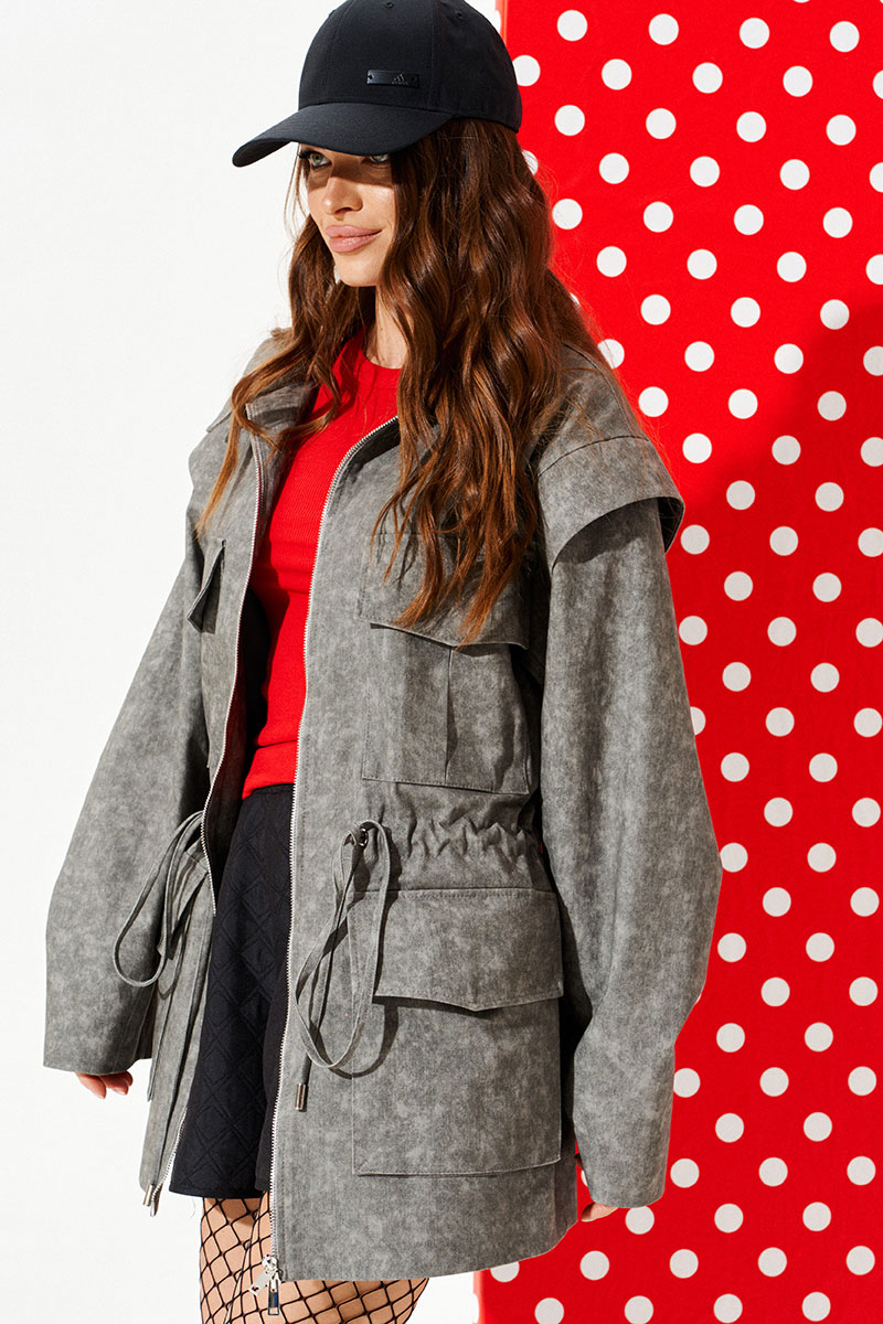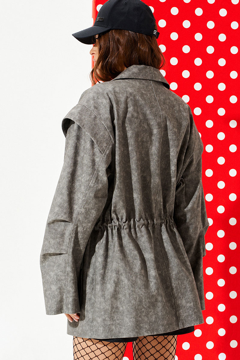 Парка свободного объема, приталенного силуэта, с центральной застежкой на тесьму-молнию, отложным воротником, на подкладке. Приталенность регулируется за счет кулиски со шнуром-завязкой и наконечниками. Детали переда с накладными карманами с клапаном. Спинка со средним швом. Рукав втачной, двухшовный, длинный. На локтевом шве рукава заложены две односторонние складки. Окат рукава оформлен отлетной деталью.