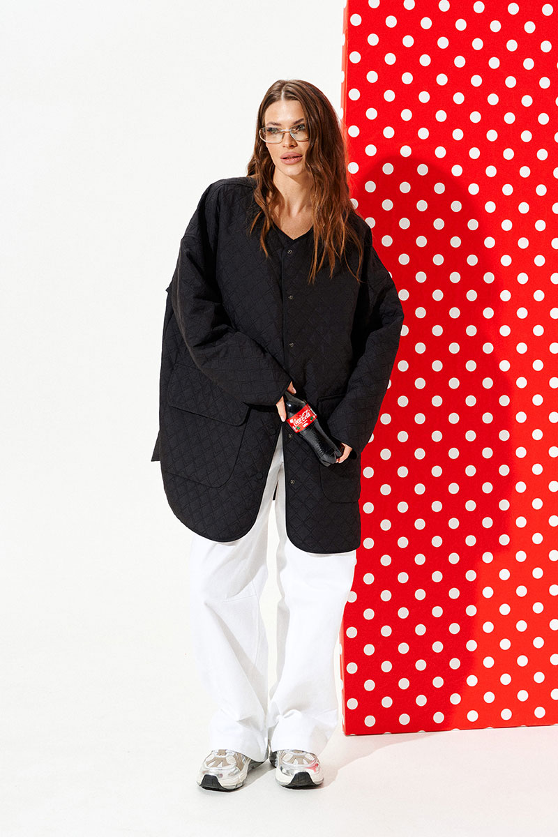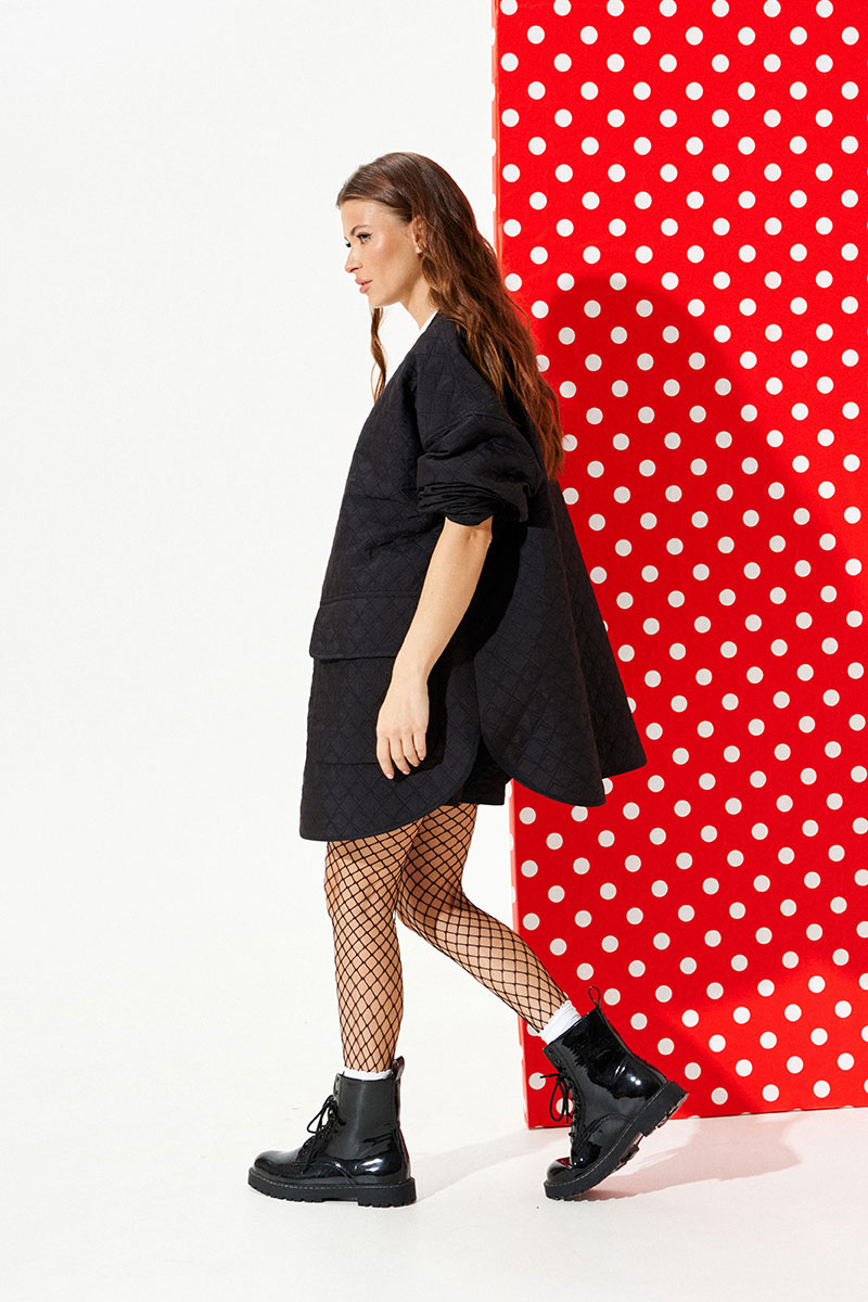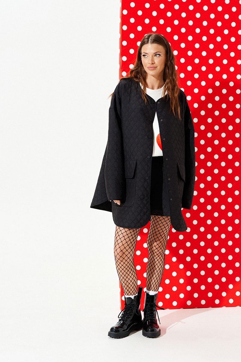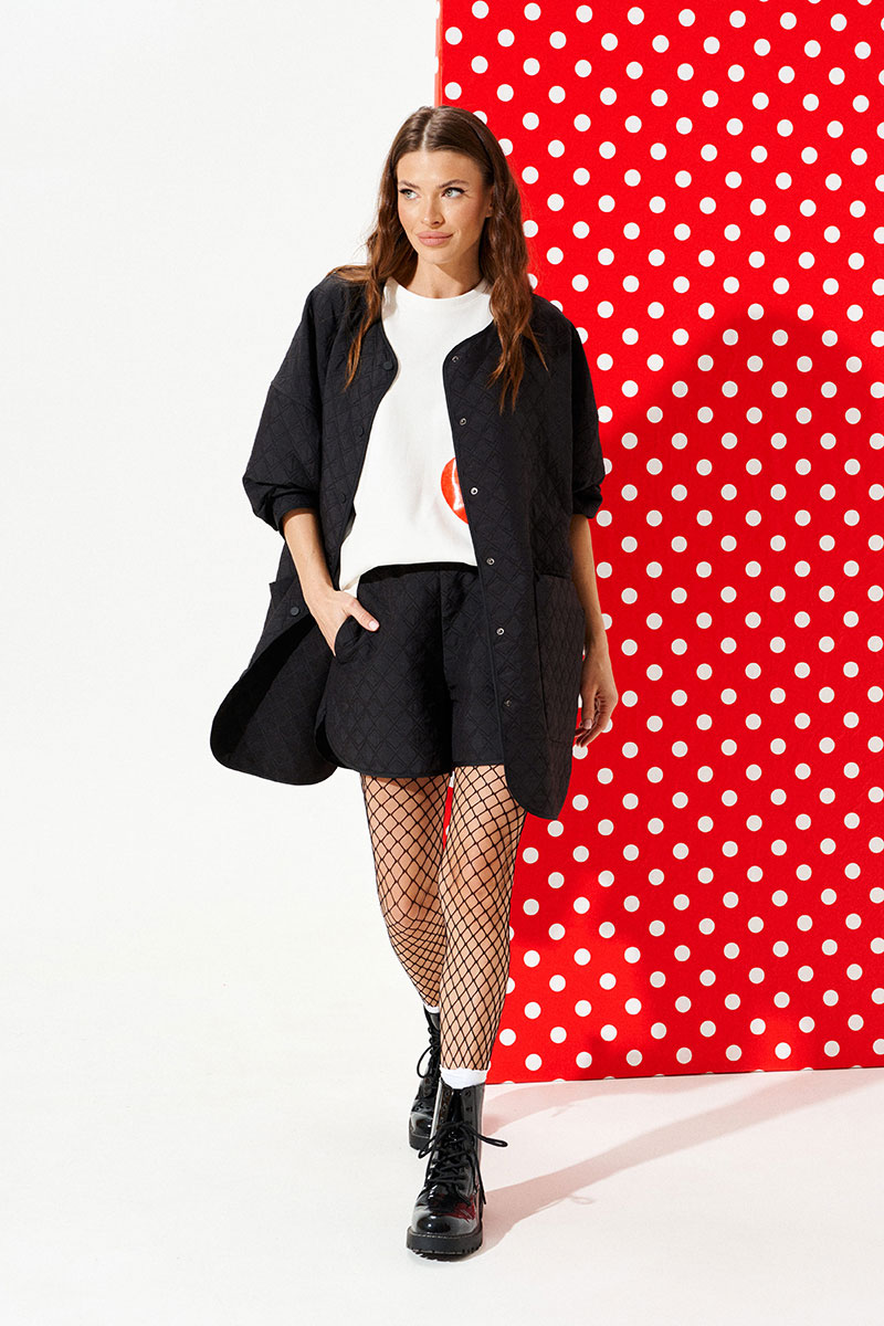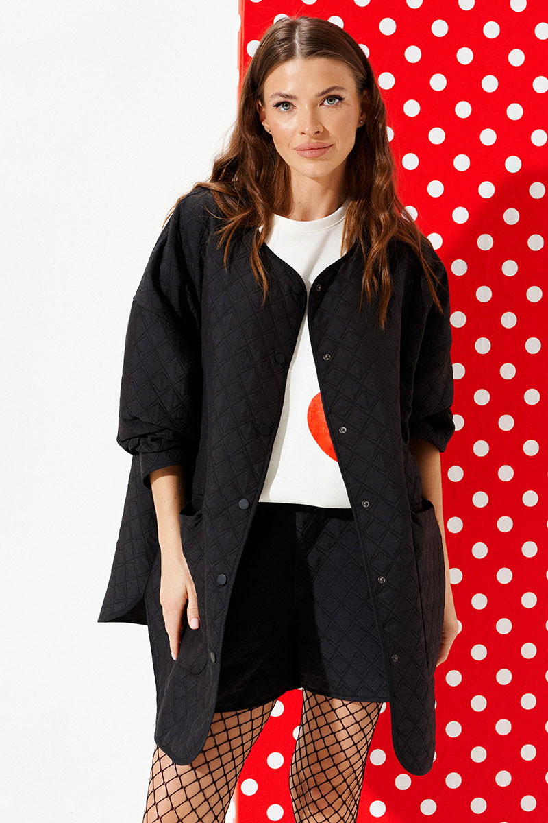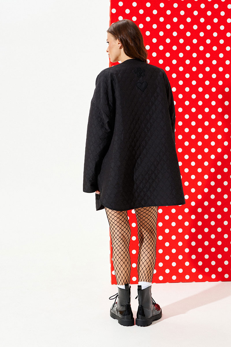 Куртка из стеганой курточной ткани свободного объема, расширенная к низу, с центральной застежкой на кнопки. Детали переда с накладными карманами с клапанами. Спинка цельная с настрочными нашивками «Цветок» и «Сердце». Линия низа фигурная. Рукав втачной, длинный. Горловина, борт, нижний срез куртки и рукава обработаны окантовочной бейкой.