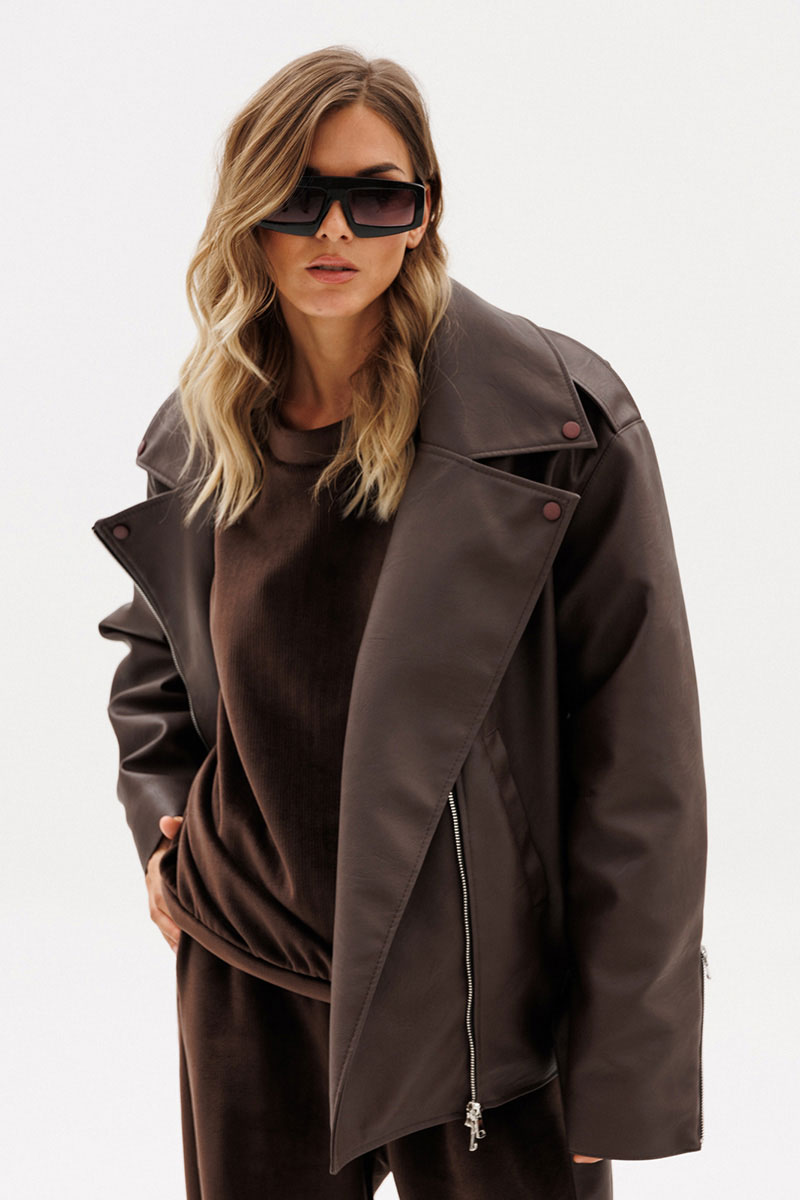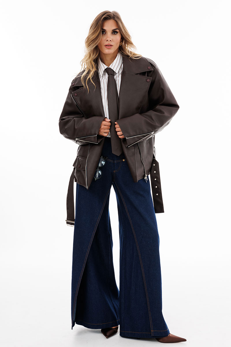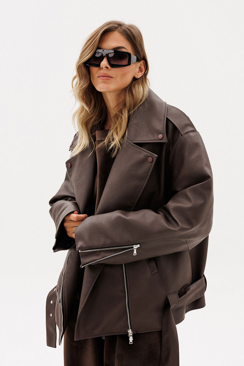Куртка выпонена из экокожи. Куртка прямого силуэта, покроя "oversize". Спереди прорезные карманы, лацканы, один клапан справа, и смещенная застежка на молнию. На спинке фигурные подрезы от плечевого шва до боковых. Вортник пиджачного типа. Плечевой шов удлинен. Рукав рубашечного покроя, двухшовный. В заднем шве рукава молния с металлическими звеньями. В окаты вставлены погоны, по низу куртки протянут пояс из основной ткани с металлической пряжкой. На концах воротника, лацконов, по погонам и клапану пробивные кнопки. Куртка на утепленной притачной по низу подкладке.